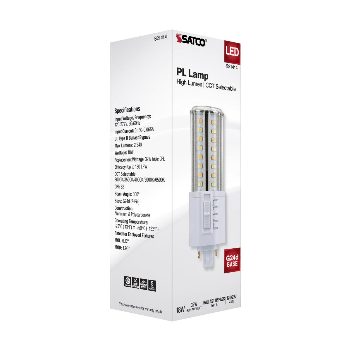 Satco Designed to deliver impressive brightness, SATCO NUVO S21414, 18-watt LED High Lumen PL Lamps outshine traditional 32-watt fluorescents. THE G24d base allows for seamless replacement of outdated fixtures, providing a hassle-free upgrade. With their advanced ballast bypass Type B technology, compatibility concerns are a thing of the past. Enjoy uniform illumination with a wide 300 degree beam angle, ensuring comprehensive coverage in any space. These lamps are engineered to withstand damp environments, making them ideal for various applications. Plus, they are rated for enclosed fixtures, ensuring optimal performance and safety.