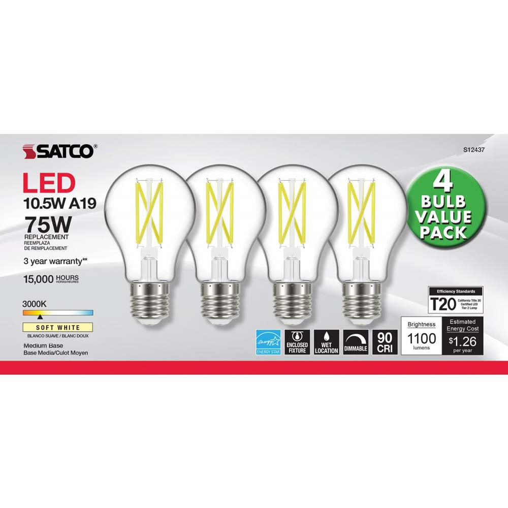 Satco 10.5-watt LED lamp is traditional, yet contemporary with its clear finish and energy saving LED technology. Elegantly illuminate any room in the house with this 4 pack of dimmable bulbs. Sophisticated and modern, this lamp delivers 15,000 hours of soft white light.