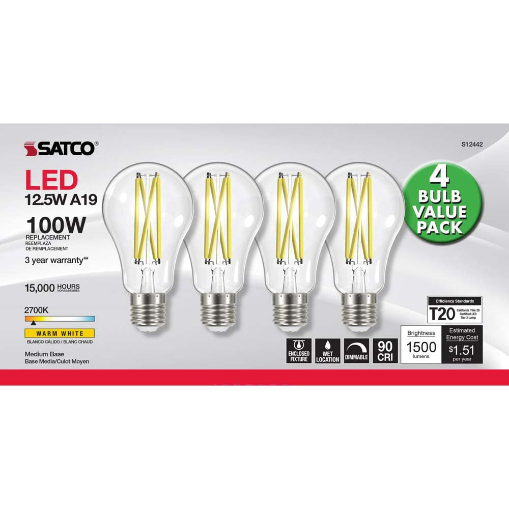 4Pk - 12.5W A19 LED Clear Medium base 2700K 120v - 100W equiv