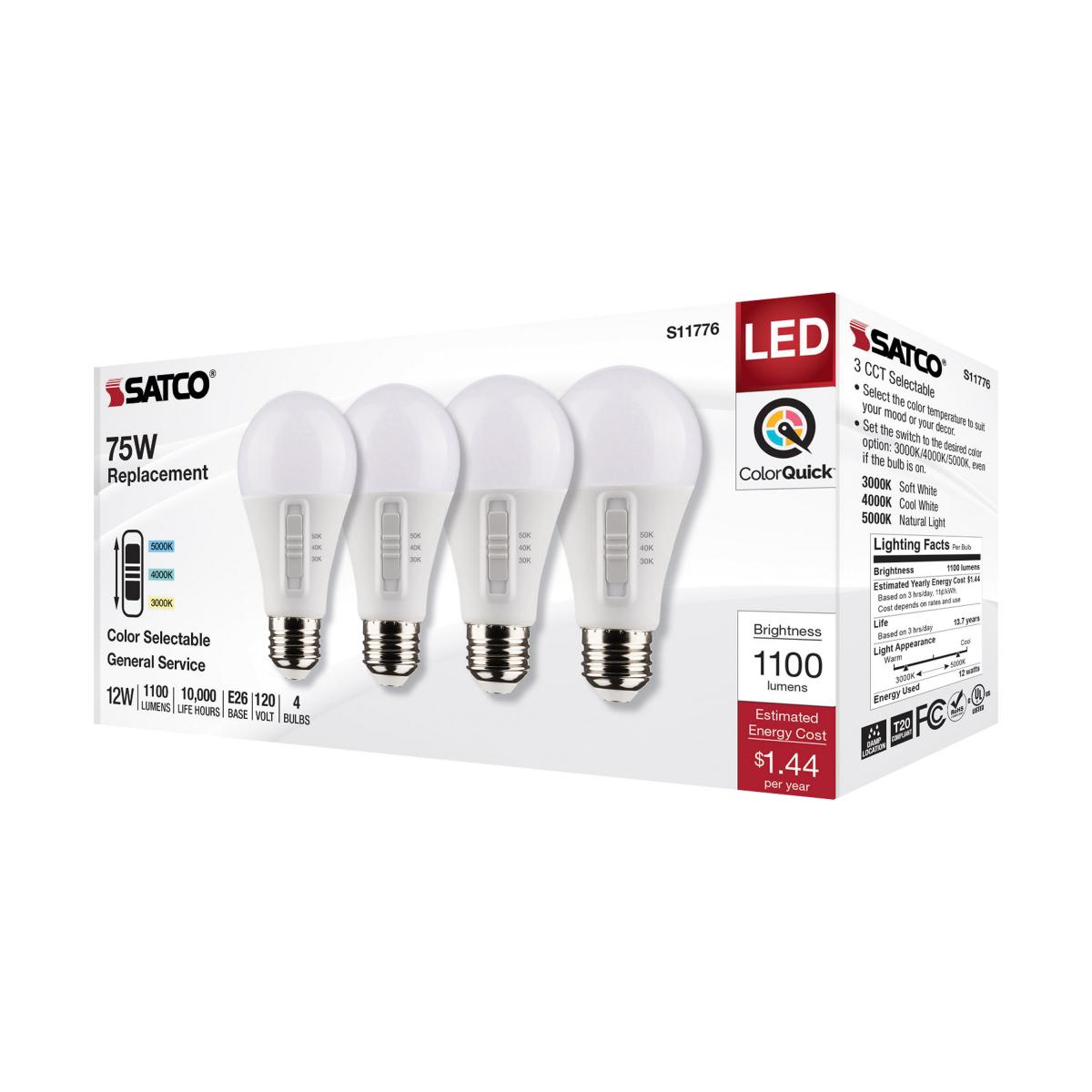 Illuminate any space with ease using SATCO NUVO 12W A19 lamps with E26 base and ColorQuick technology. These versatile lamps allow you to choose the perfect color temperature for any room, creating an atmosphere that suits your mood. Whether you want to relax in the living room after a long day, or work in a well-lit office, our lamps offer the perfect lighting solution. With a high 90 CRI, our lamps provide exceptional color rendering, ensuring that colors look vibrant and true-to-life. They are also rated for damp locations and enclosed fixtures, making them suitable for use in any area of your home. Ideal for use in bedrooms, living rooms, offices, table lamps, floor lamps, ceiling fans, and more, these A19 lamps are the perfect addition to any space. Sold in packs of 4 per box, these lamps make them ideal for easy retail or contractor sale.