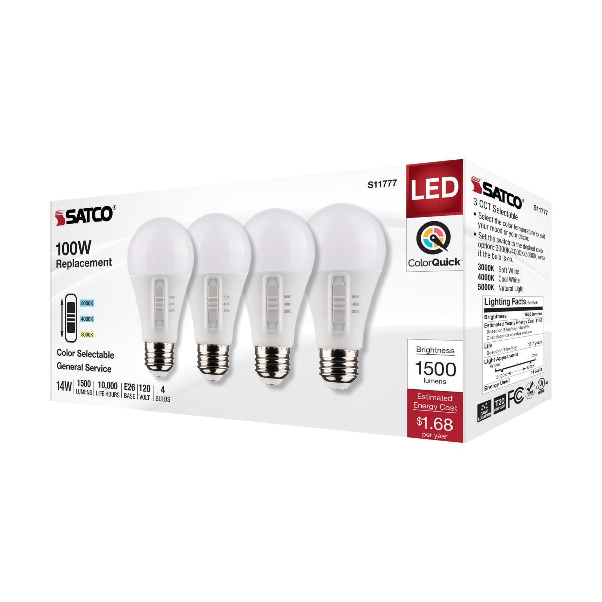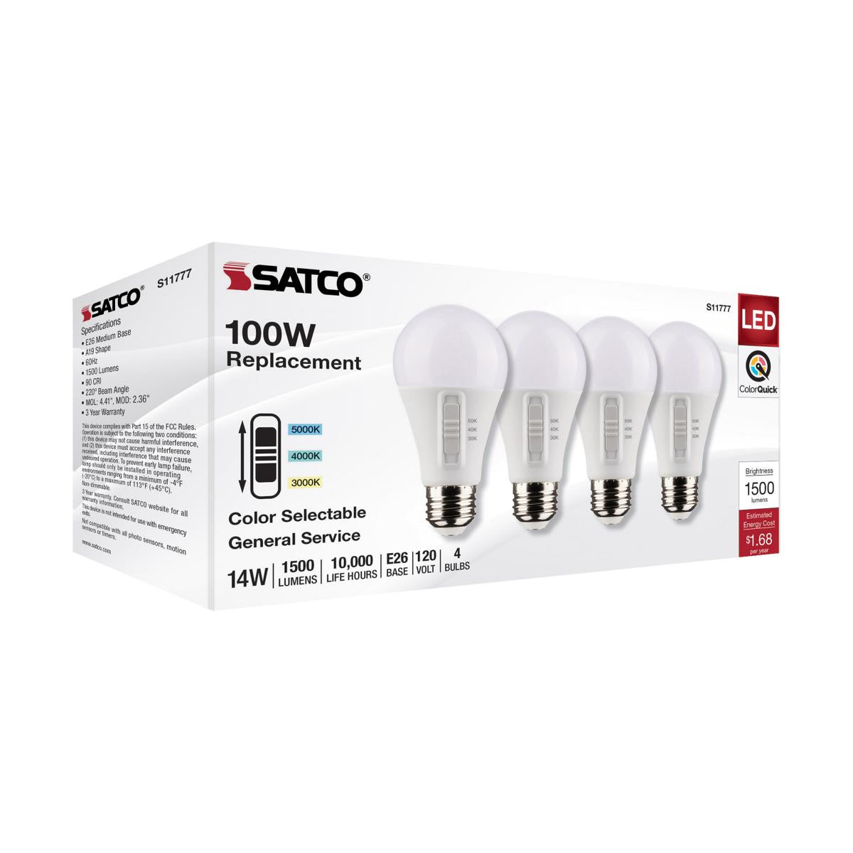 4Pk - Satco 14w A19 LED 120v CCT Selectable 90 CRI White Finish Bulb