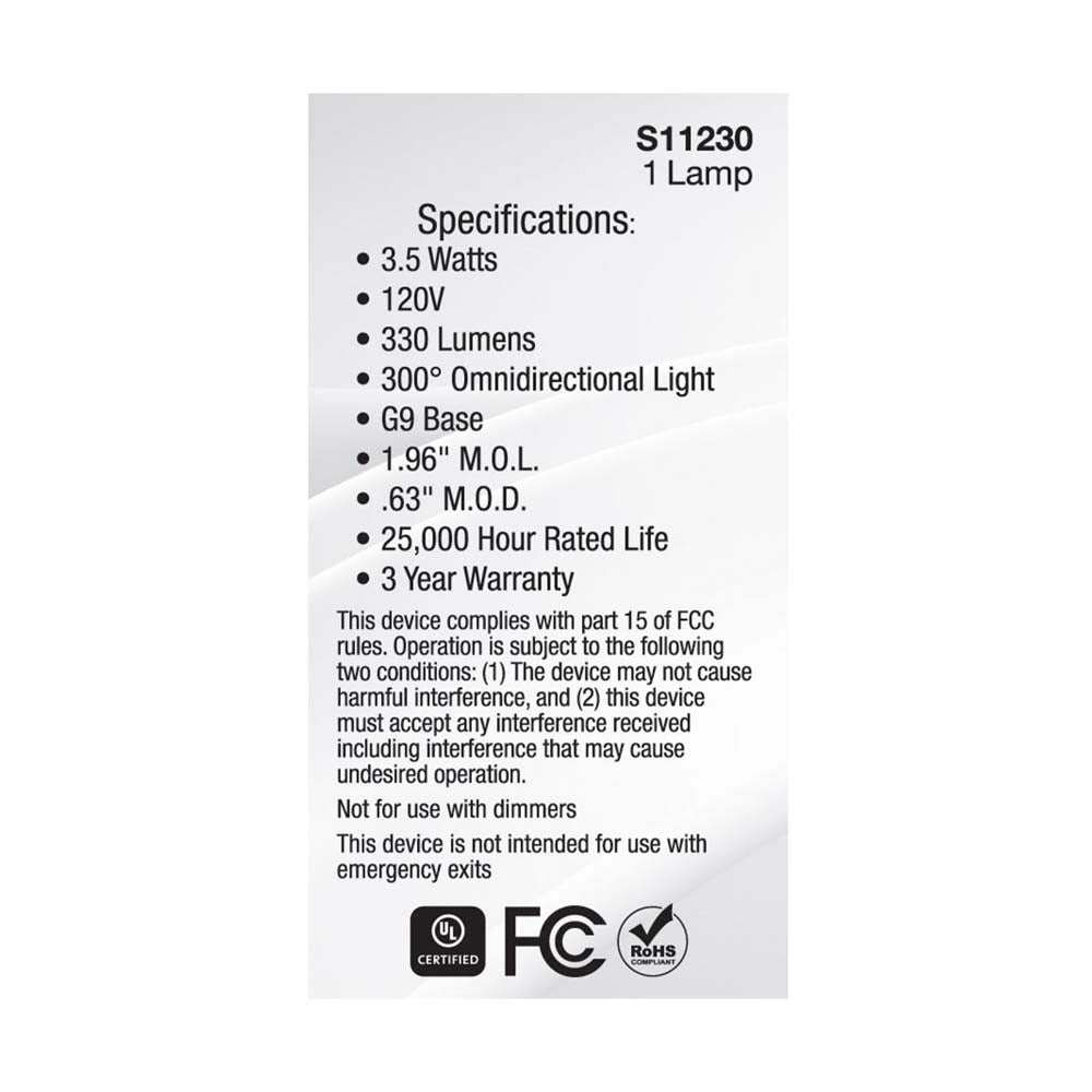 The S11230 LED T4 lamp is specifically designed to perform when efficiency and low maintenance is required. This clear lamp features 300 degrees of omni-directional light, has a color temperature of 3000K and is damp location rated. This advanced, decorative LED lighting is manufactured with the latest technologies making them well-suited for commercial use in restaurants, ballrooms, hotel applications, and more.