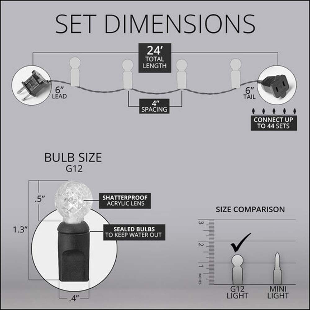 Wintergreen Lighting G12 LED 70 lights produce exceptional brightness with minimal energy consumption. Bulbs cast a Cool White glow, enhancing indoor and outdoor lighting in every season. Strong bulbs are molded into sockets for a secure fit that locks out elements, resulting in longer life. LED globe lights offer a fresh prospective on lighting, with bold colors in small 12mm lamps. Green Wire. ENERGY STAR rated, UL Listed - Save money, save power, save energy.