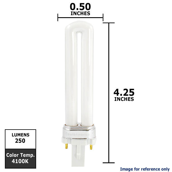 This bulb uses 5 watts has a base of G23. It is manufactured by Ushio, has a color temperature of 4100k and a lumens of 250. It has a diameter of 0.50 inches, a maximum overall length of 4.25 inches and a rated life of 10,000 hours. It has a color rendering index of 85, an abbreviation name of CF5S/841 and a Single tube 2-pin Shape.