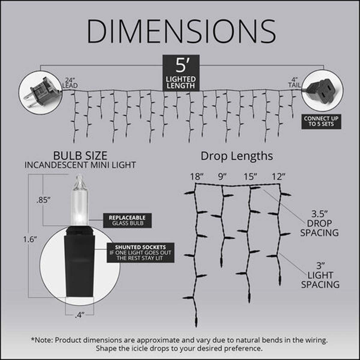 Dimensions: 24" lead, 3" spacing, 4" tail, 5.3' total string length, 16" - 14" - 9" drop lengths, 18 total drops