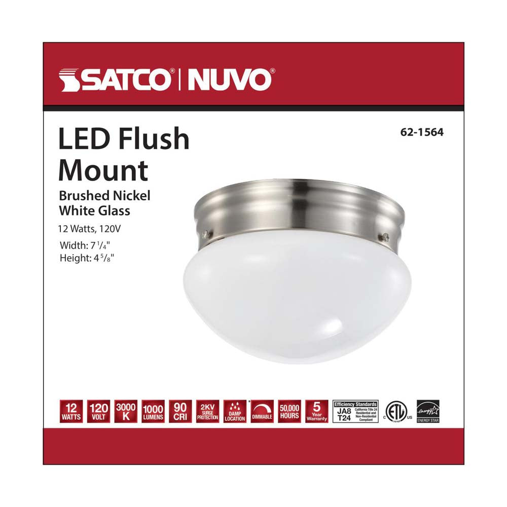 Satco's 12-watt, 7 inch LED flush mount offers the perfect blend of integrated LED technology and utility-style lighting. This simple flush mount illuminates a dark stairwell, hallway or laundry room, to name a few applications. The frosted glass allows for plenty of light while reducing hot spots and the brushed nickel blends with existing finishes.