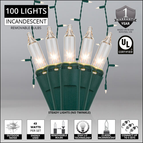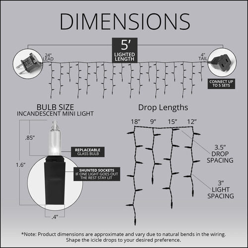 Dimensions: 12" lead, 3" spacing, 4" tail, 9.0' total string length, 18" - 15" - 12" - 9" drop lengths, 27 total drops