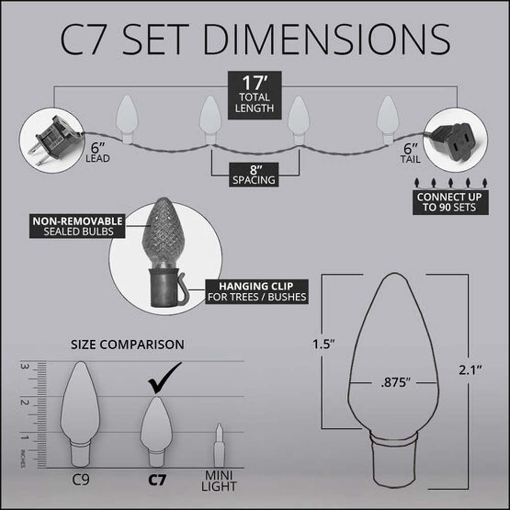 Wintergreen Lighting C7 LED lights produce exceptional brightness with minimal energy consumption. Bulbs cast a Warm White glow, enhancing indoor and outdoor lighting in every season. Strong bulbs are molded into sockets for a secure fit that locks out elements, resulting in longer life. Retro C7 LED light strings for large projects, events, and holidays. ENERGY STAR rated, UL Listed - Save money, save power, save energy.