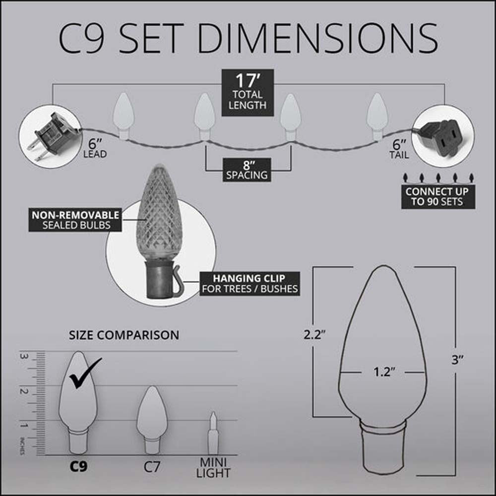 Wintergreen Lighting C9 LED lights produce exceptional brightness with minimal energy consumption. Bulbs cast a Warm White glow, enhancing indoor and outdoor lighting in every season. Strong bulbs are molded into sockets for a secure fit that locks out elements, resulting in longer life. C9 LED lights step above traditional lighting for events and holidays. ENERGY STAR rated, UL Listed - Save money, save power, save energy.