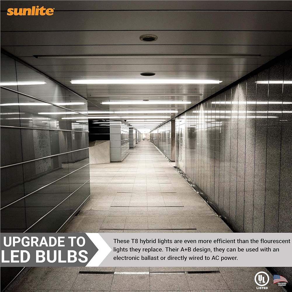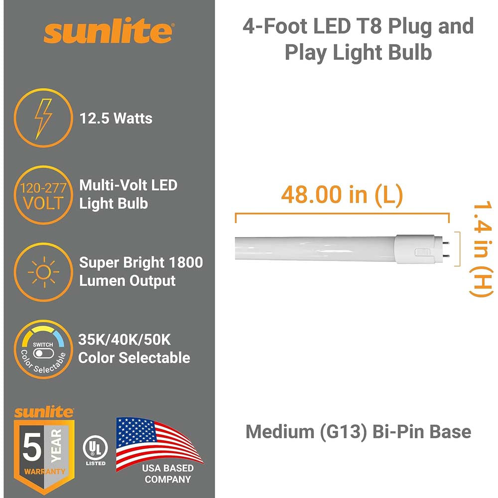 Discover Sunlite innovative T8 LED bulb, featuring adjustable color temperature (3500K, 4000K, or 5000K) with a built-in switch, and a versatile Type A+B design for compatibility with electronic ballasts or direct AC power. The easy-to-install medium 2-Pin G13 Base suits various applications, including commercial and industrial spaces. Compatible with both instant-start and programmed-start ballasts, enjoy up to 50,000 hours of energy-efficient lighting with just 12.5 watts of power. UL Listed for damp locations, this multi-volt (120-277) bulb ensures safety and quality in diverse settings. Bulb Dimension 1.4 H x 1.4 W x 48 D.