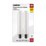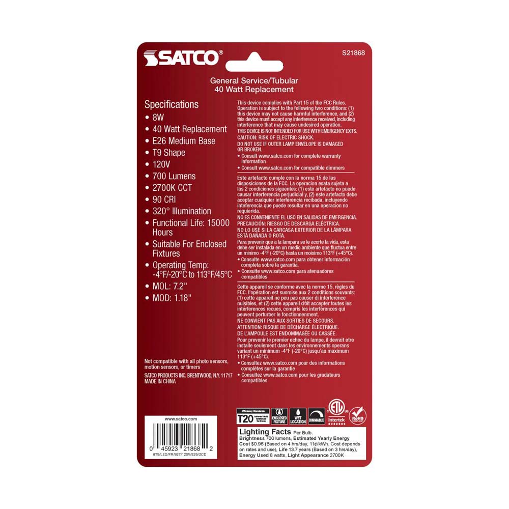 Satco 8-watt, T9 LED bulb with a medium base is dimmable and offers warm white light with a 320 degree beam spread. Wet rated for use in kitchens and bathrooms, the carded 2-pack is suitable for retail display. Elegant and long-lasting, this frosted bulb delivers 15,000 hours of exceptional illumination.
