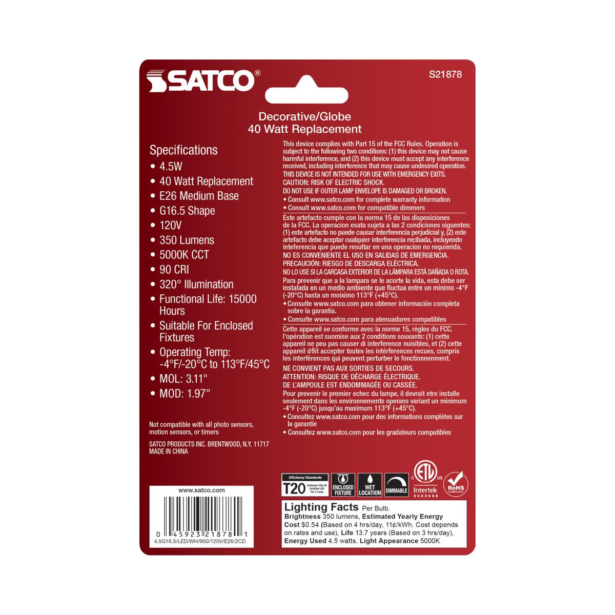 SATCO NUVO S21878 4.5-watt white, LED G16.5 bulb with a medium base is dimmable and offers 5000K natural light. Wet rated for indoor and outdoor applications, the carded 2-pack is suitable for retail display. Elegant and long-lasting, this clear bulb delivers 15,000 hours of exceptional illumination.