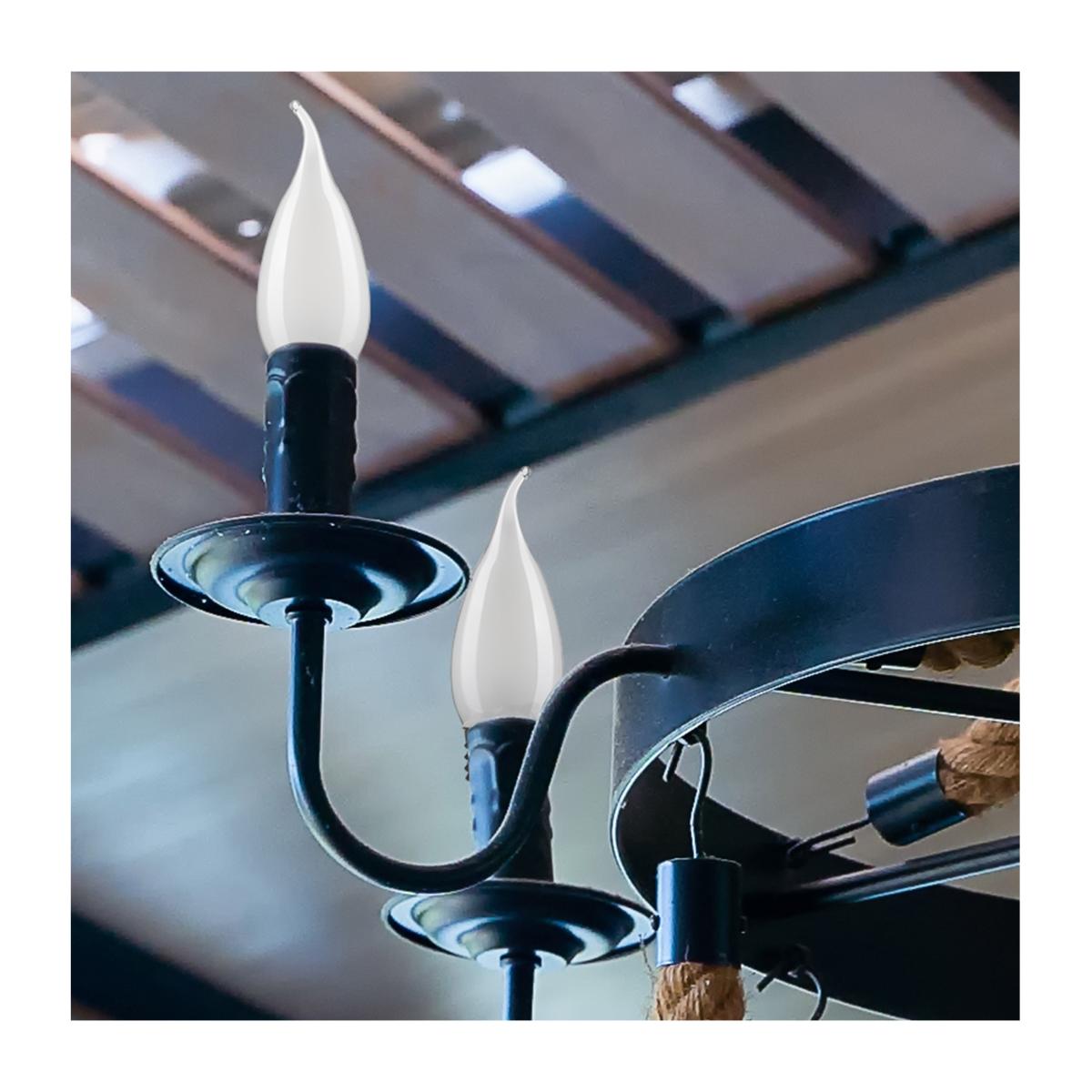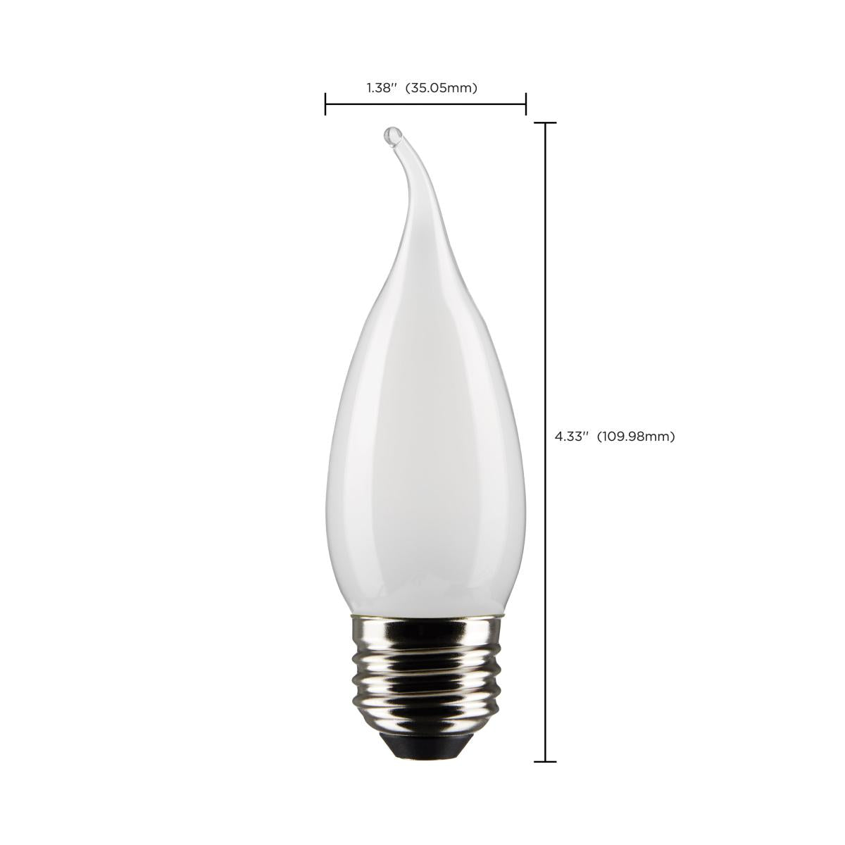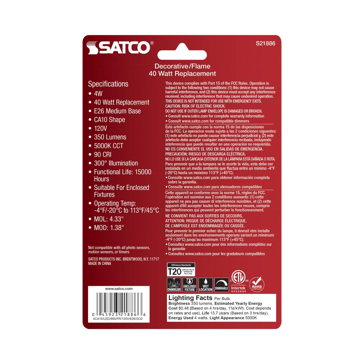 SATCO NUVO S21886 4-watt frost, LED CA10 bulb with a medium base is dimmable and offers 5000K natural light. Wet rated for indoor and outdoor applications, the carded 2-pack is suitable for retail display. Elegant and long-lasting, this clear bulb delivers 15,000 hours of exceptional illumination.