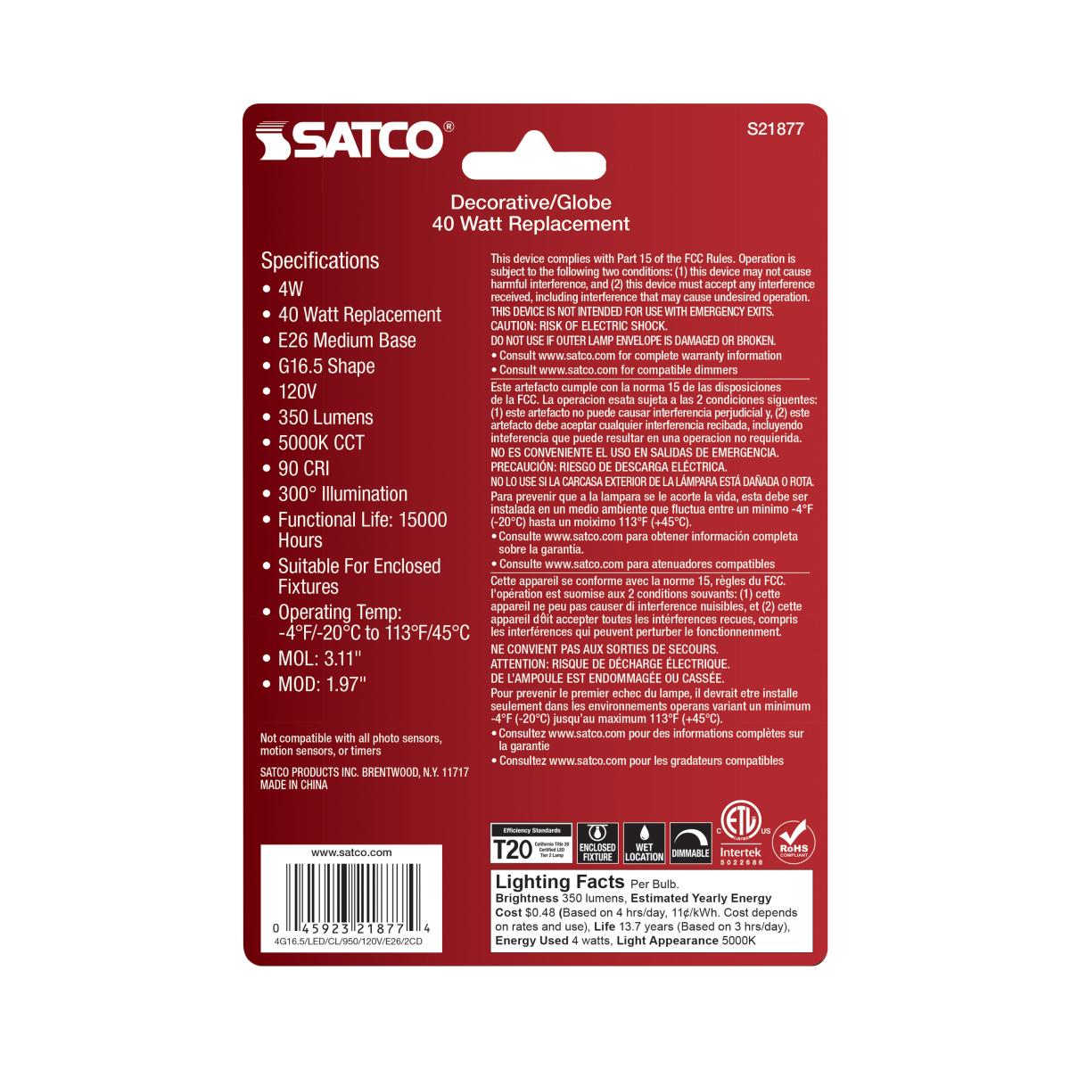 SATCO NUVO S21877 4-watt clear, LED G16.5 bulb with a medium base is dimmable and offers 5000K natural light. Wet rated for indoor and outdoor applications, the carded 2-pack is suitable for retail display. Elegant and long-lasting, this clear bulb delivers 15,000 hours of exceptional illumination.