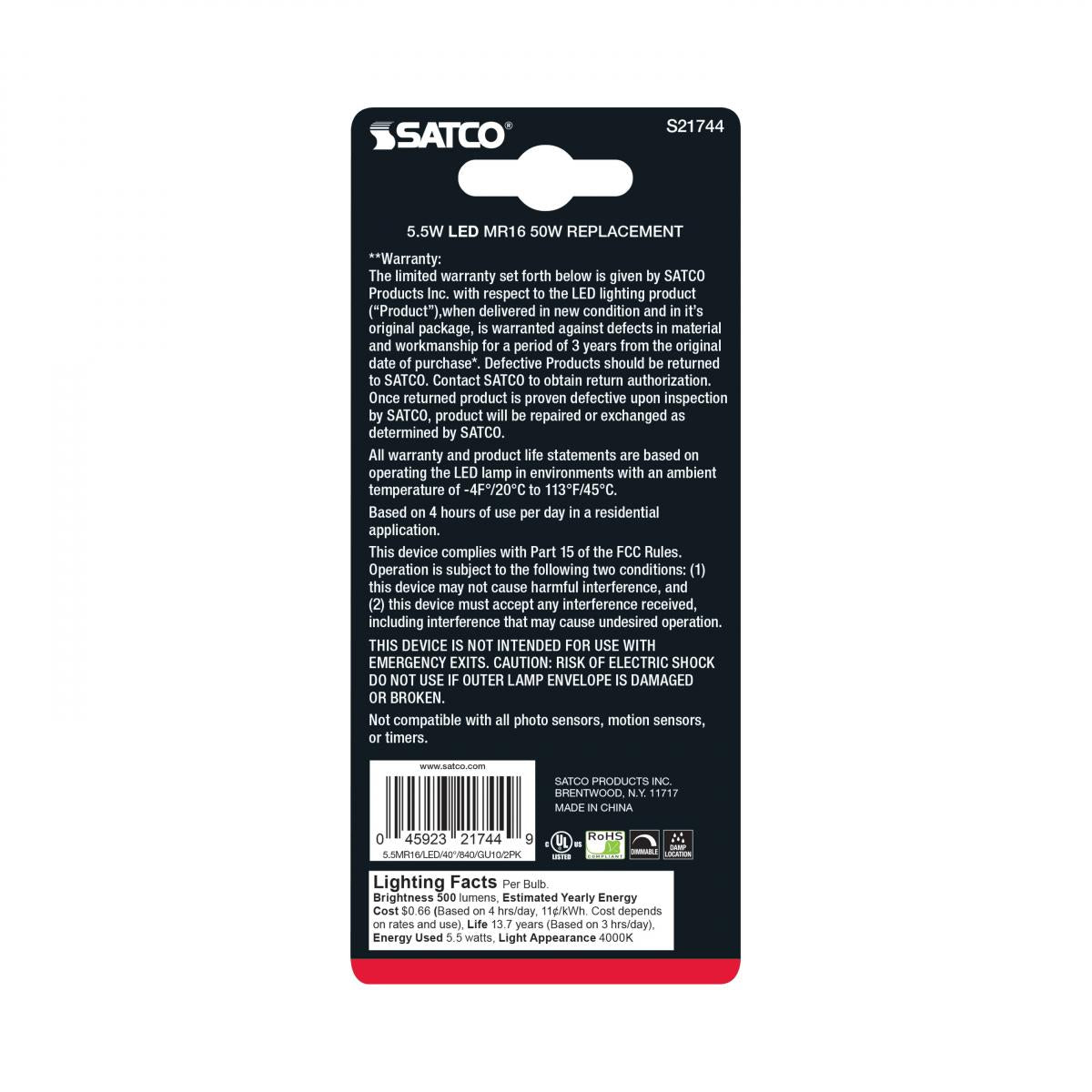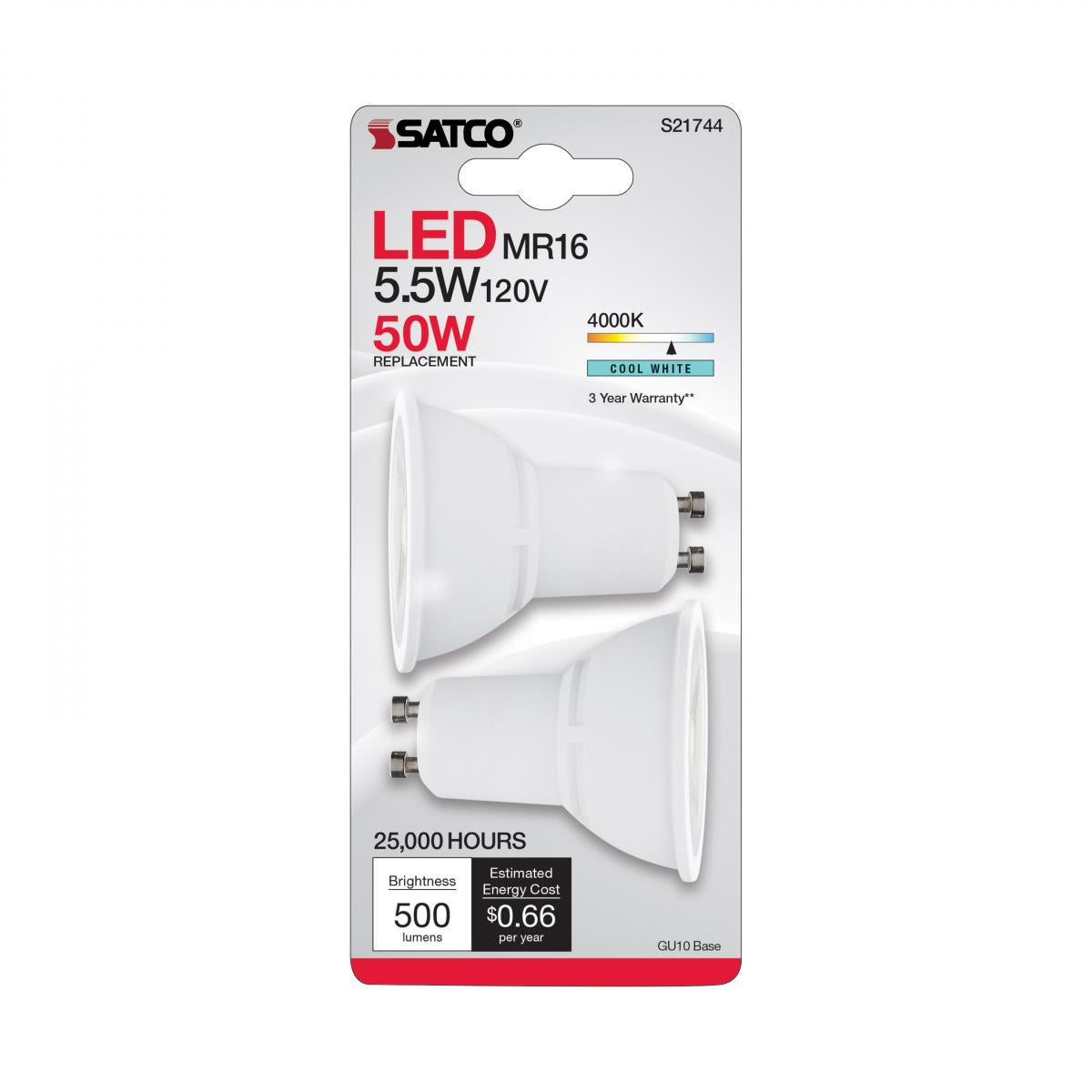 SATCO NUVO LED Mini-Reflectors are a direct replacement for outdated Halogen lamps. SKU S21744 is a 5.5-watt, 4000K, MR16 lamp with a GU10 base that will easily fit into existing fixtures to upgrade down lighting, accent lighting and pendant lighting. This long-lasting lamp delivers roughly 25,000 hours of exceptional illumination.