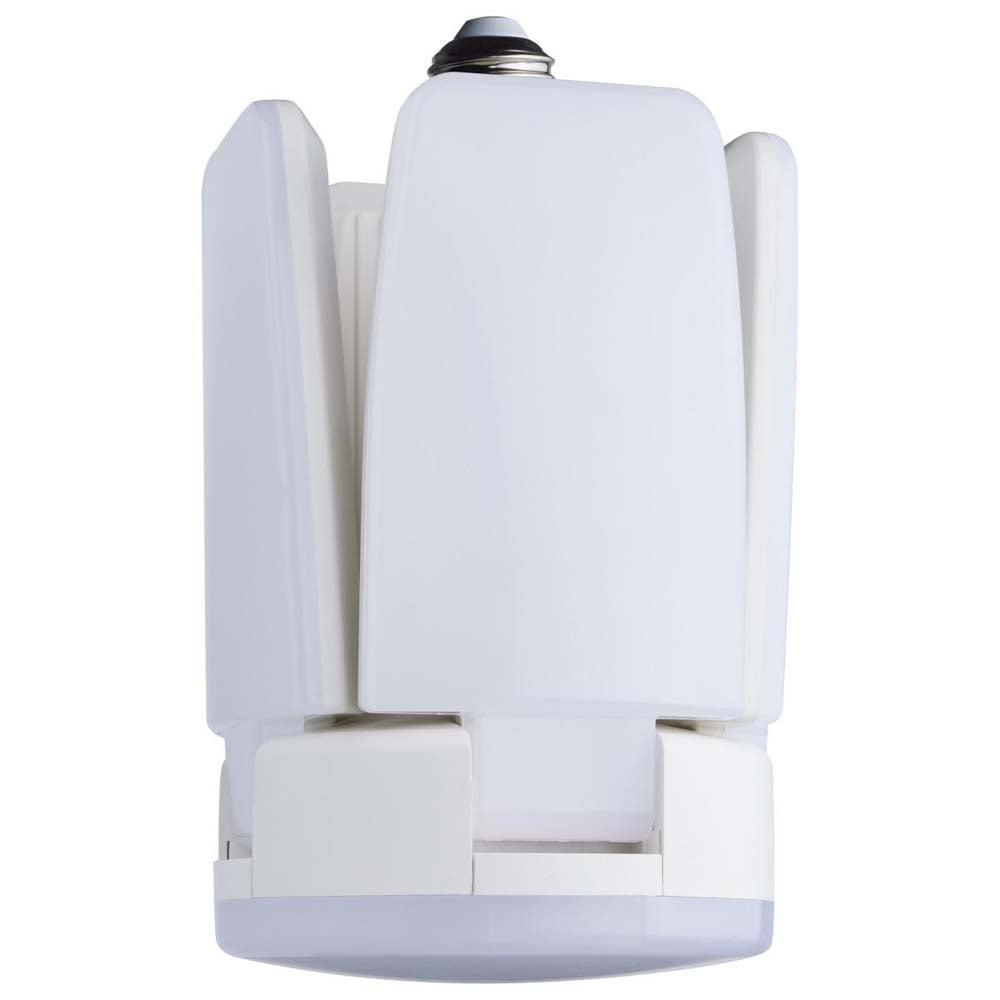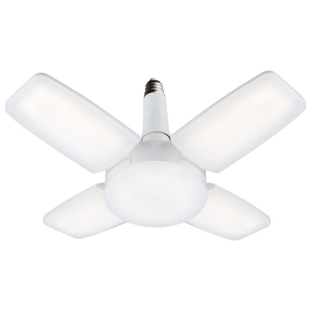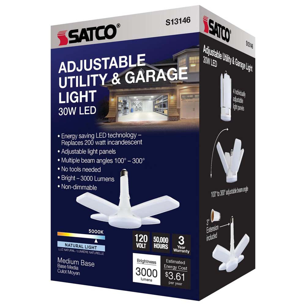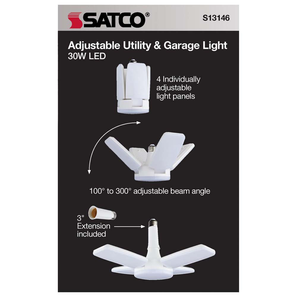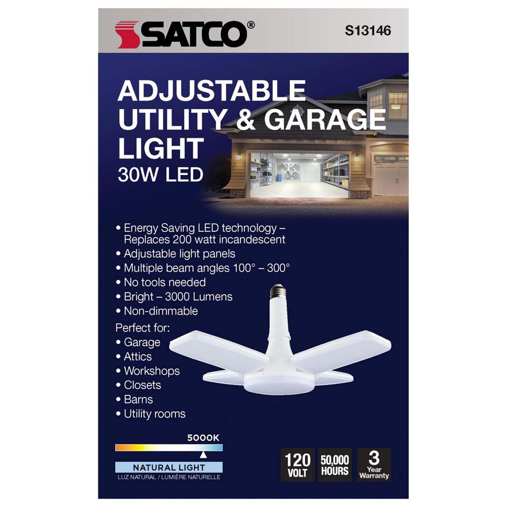 Satco latest LED adjustable utility light is one of the easiest improvements for homeowners and contractors alike. The 30-watt LED bulb replaces 200-watt incandescent bulbs. The four adjustable light panels allow for a multitude of beam angles. The standard E26 base is perfect for garages, barns, workshops, storage areas, attics, closets, and utility rooms - virtually any larger space that requires superior, efficient, energy saving, and long-lasting LED light.
