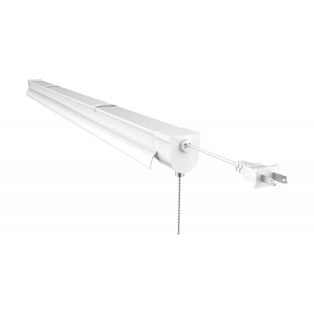 Satco 34-watt, 3-foot LED shop light with a pull chain is the perfect solution for workspaces that require superior light output. Flush mount on the ceiling or suspend from above with the included hardware. The shop light features an ON/OFF pull chain operation and a 5-foot long plug-in connection. This rugged, quality constructed shop light offers 50,000 hours of long, maintenance-free LED life. The light includes 9-inch hanging cables, mounting screws, surface mounting clips, and drywall anchors.