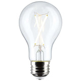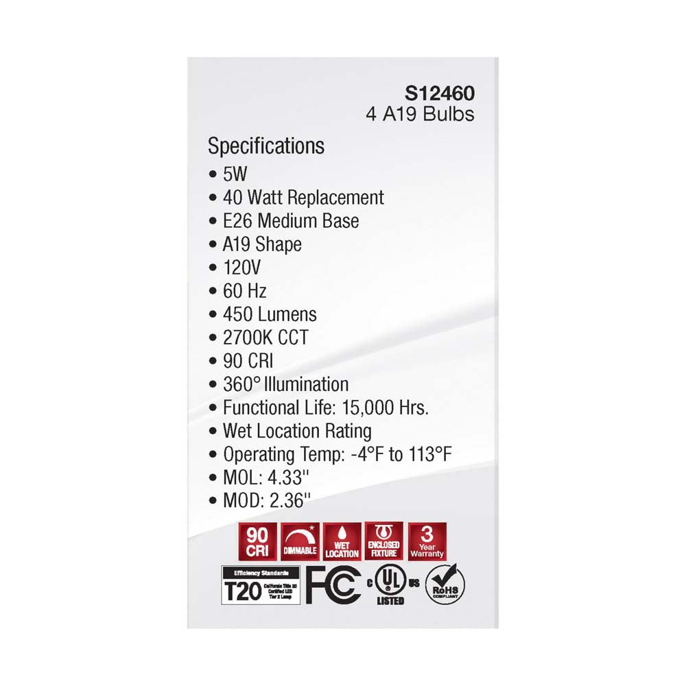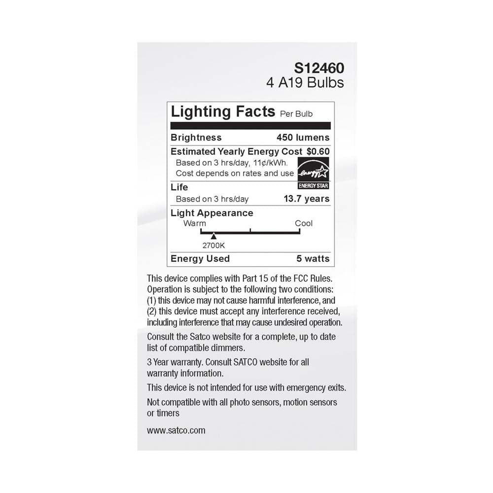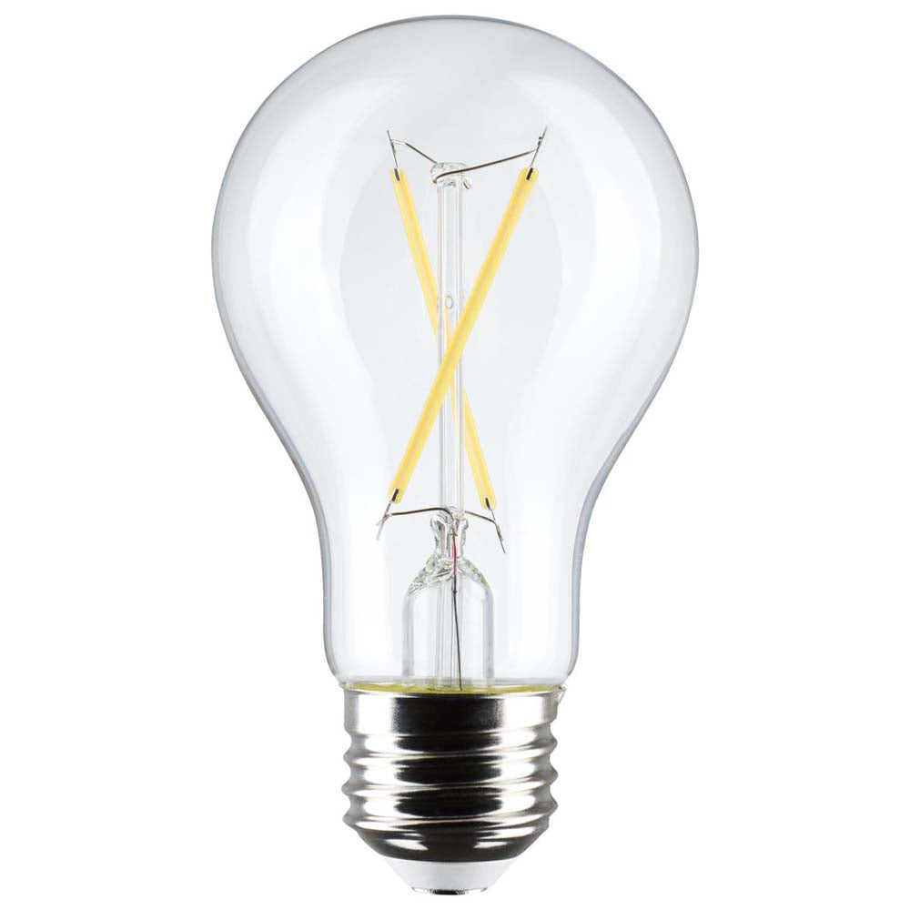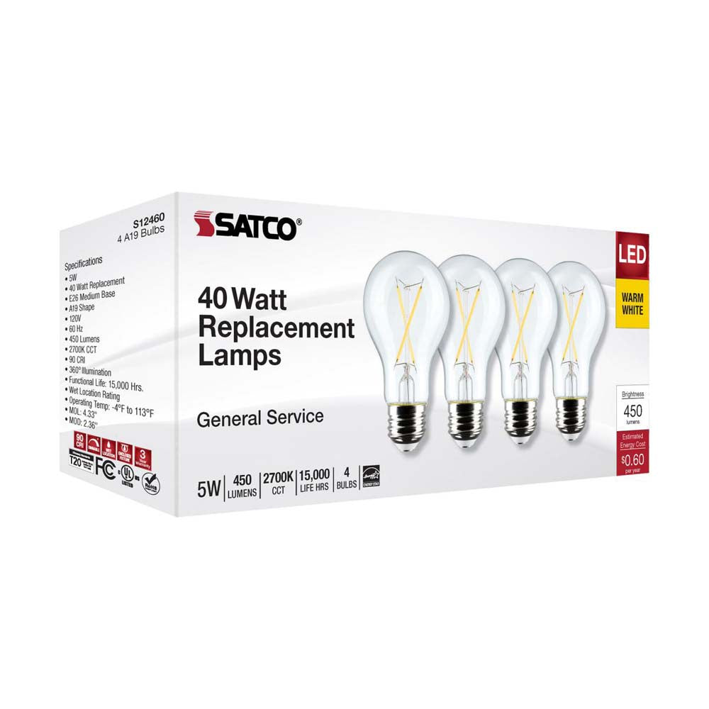 Satco 5-watt, A19 LED bulb with a medium base is dimmable and offers warm white light with a 280 degree beam spread. Wet rated for use in kitchens and bathrooms, this clear bulb is sold in a convenient 4-pack. Elegant and long-lasting, this clear bulb delivers 15,000 hours of exceptional illumination.