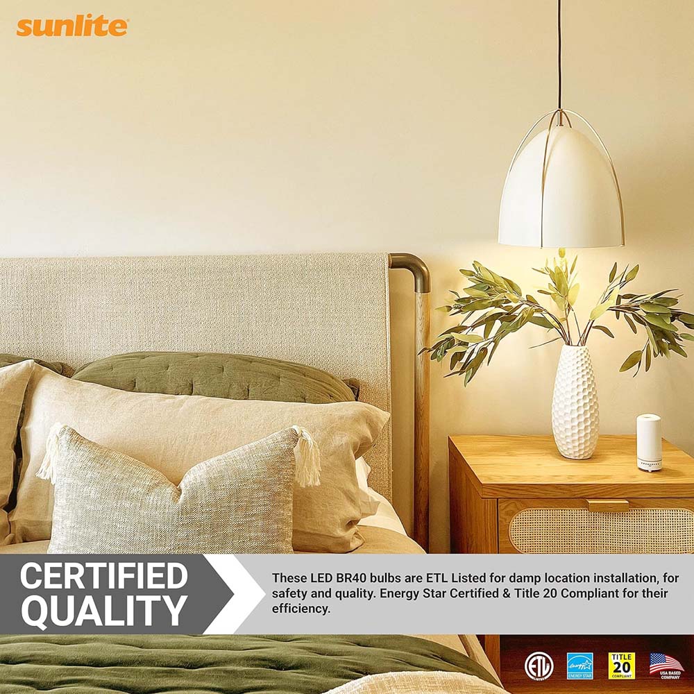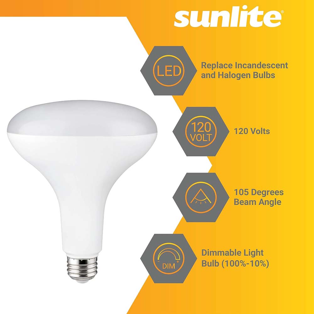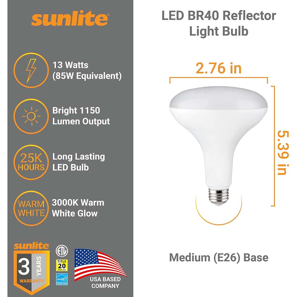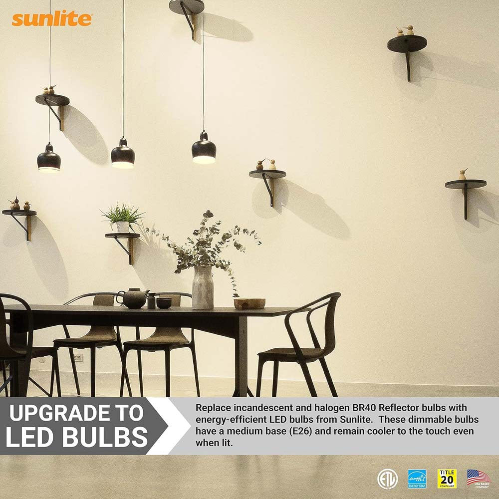 FEATURES:- UPGRADE TO LED - Replace incandescent and halogen BR40 bulbs with energy efficient LED bulbs from Sunlite. These dimmable bulbs have a medium base (E26) and remain cooler to the touch even when lit.