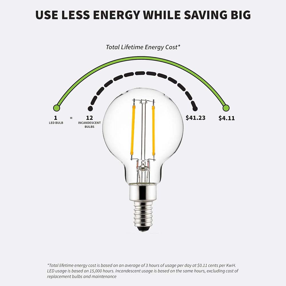 FEATURES:- UPGRADE TO LED - Upgrade your lighting to LED technology with these Candelabra Base globe bulbs. These bulbs put out at much light as a 25 watts bulb while only using 2.5 watts of electricity. Color rendering index (CRI) of 85. LED technology means they are cool to the touch when lit and instant-on at full brightness.