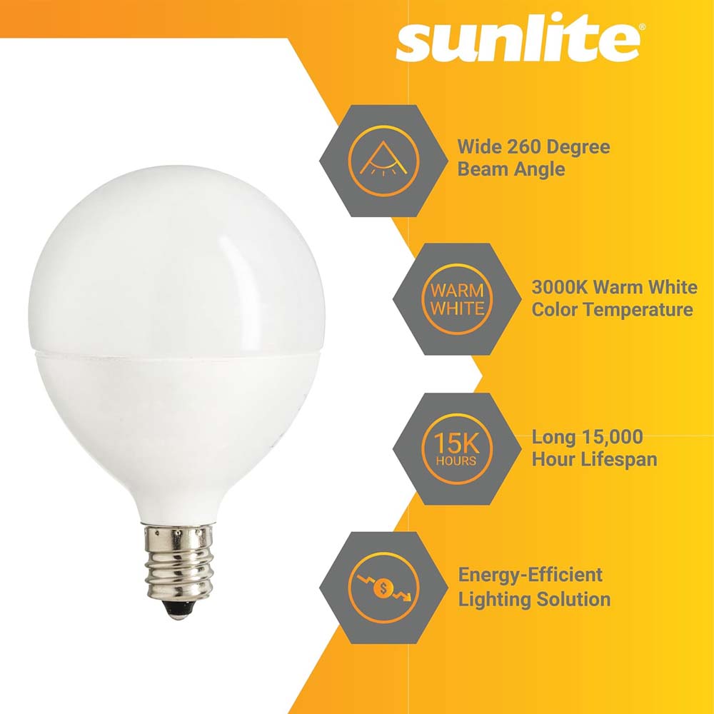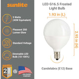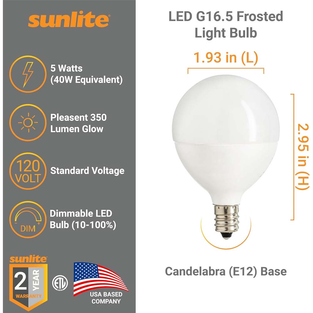 Upgrade your indoor lighting with Sunlite LED G16.5 Frosted Globe Light Bulb. These bulbs put out as much light as a 40 watts bulb while only using 5 watts of electricity. With LED technology you save cost and the hassle of replacing hard to reach bulbs. With an average life of 15,000 hours, youll get years of reliable service. The annual energy cost is a low $0.60 per bulb (based on 3 hours/day at $0.11 per/kWh). At 3000K, these warm white bulbs provide a comforting glow in bedrooms, living spaces or anywhere you want to set relaxed mood. These bulbs are ETL Listed for damp location installation. These bulbs contain no mercury or other harmful chemicals. Dimensions 2.95 L x 1.93 D.