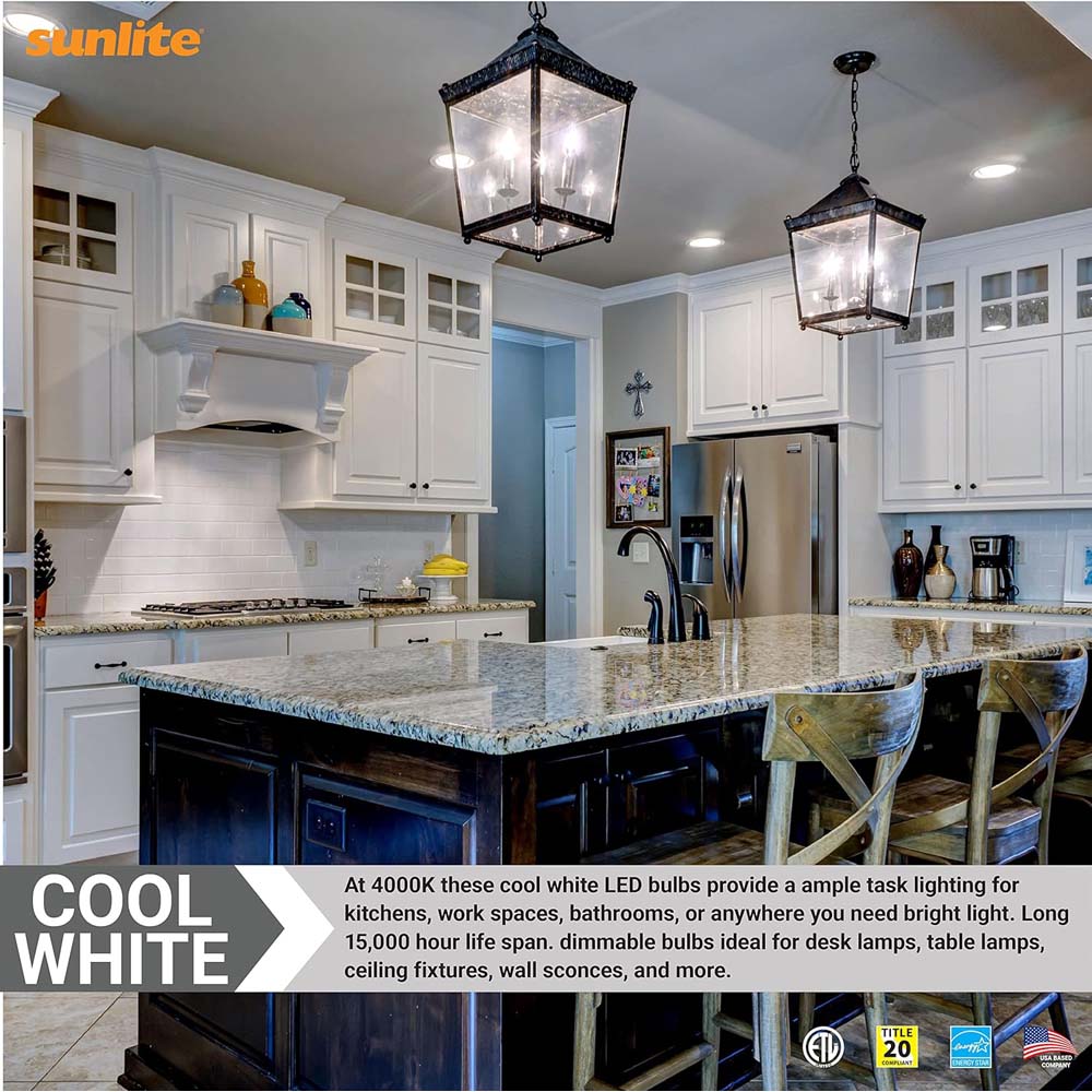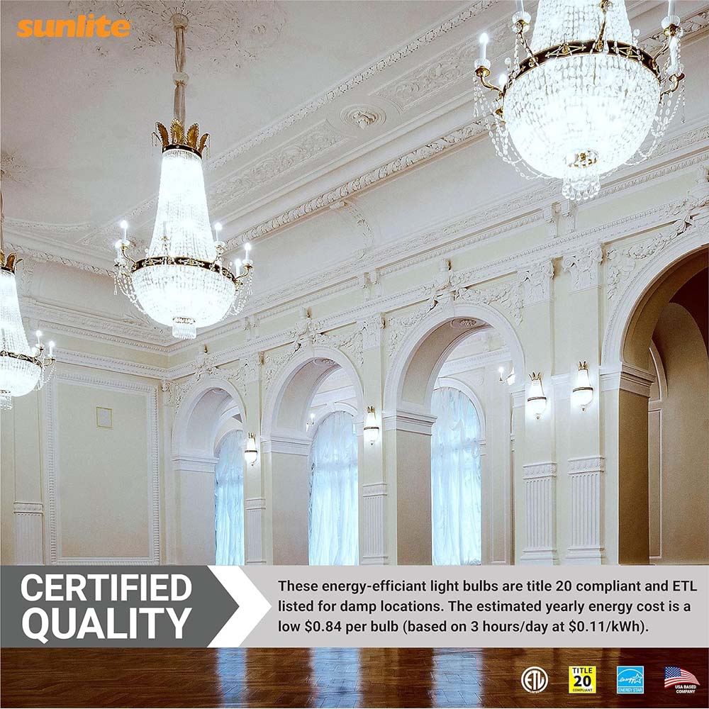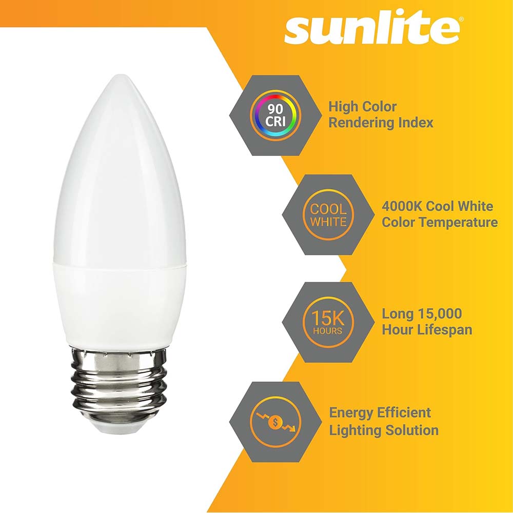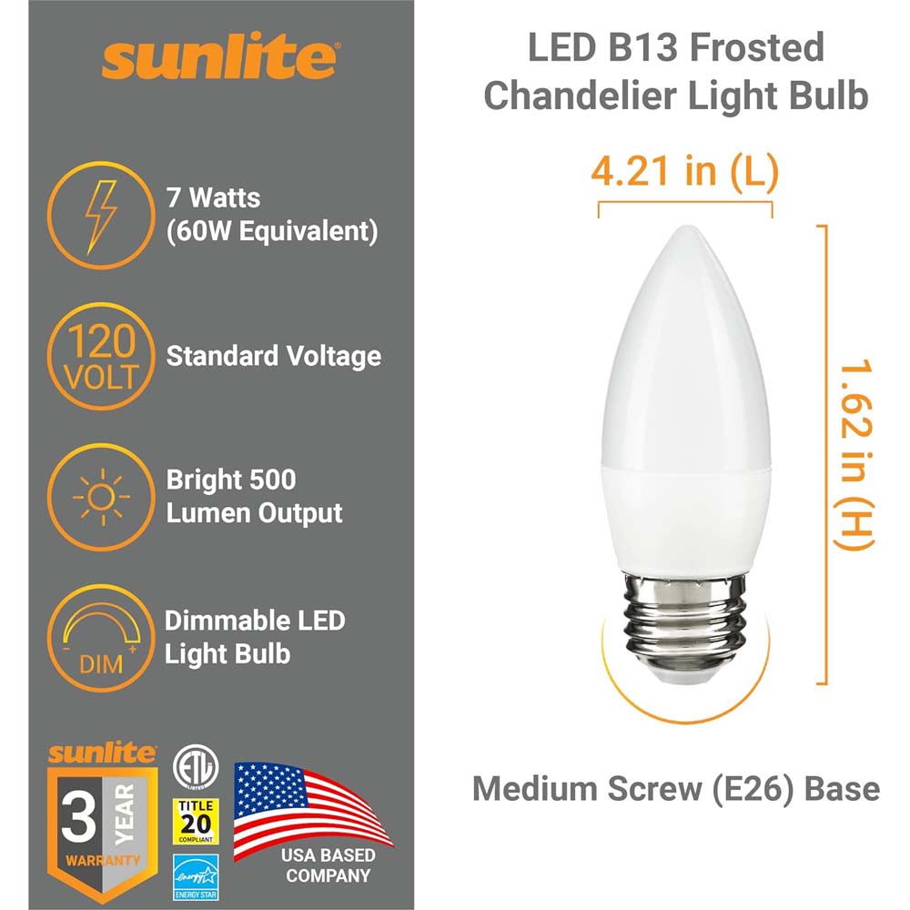 Sunlite LED B13 Chandelier Light Bulb uses a unique, decorative bulb shape that is ideal for chandeliers and other high-ceiling fixtures. These Chandelier Style light bulbs are dimmable when installed in a lamp or fixture with dimming capabilities, creating your favorite tone depending on your mood in any space. They give off as much light as a 60-watt bulb while only using 7 watts of power. High CRI (Color Rendering Index) of 90. youll see truer and more vivid colors right before your eyes. Estimated yearly energy cost is a low $0.84 (Based on 3 hours/day use at $0.11/kWh). These bulbs are Energy Star Certified and may qualify you for state and local rebates. At 4000K these cool white bulbs provide ample lighting for hallways, stairways, closets, bathrooms, vanities or anywhere you need cool and bright light. ETL Listed for damp location installation. Dimension at 4.21 Length. Title-20 Compliant.