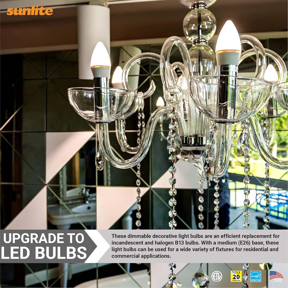 FEATURES:- UPGRADE TO LED - Replace incandescent and halogen B13 bulbs with energy efficient LED bulbs from Sunlite. These dimmable bulbs have a medium base E26 and remain cooler to the touch even when lit.