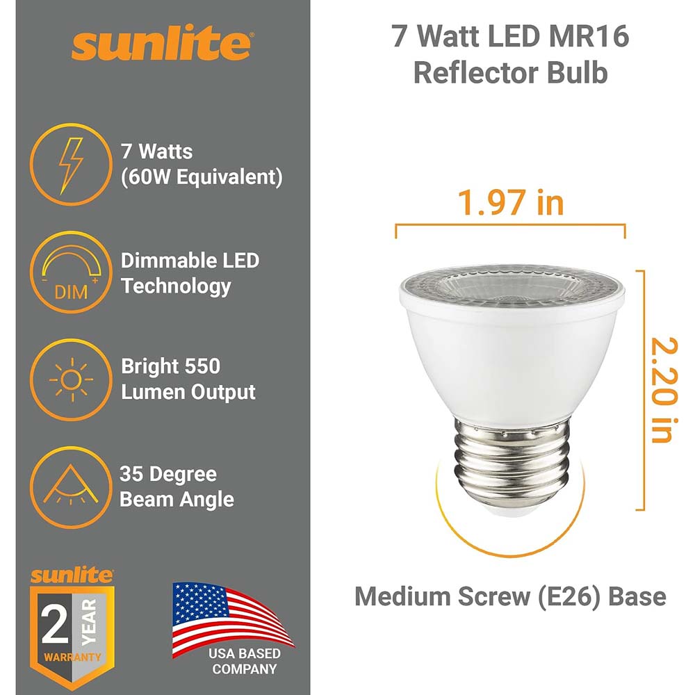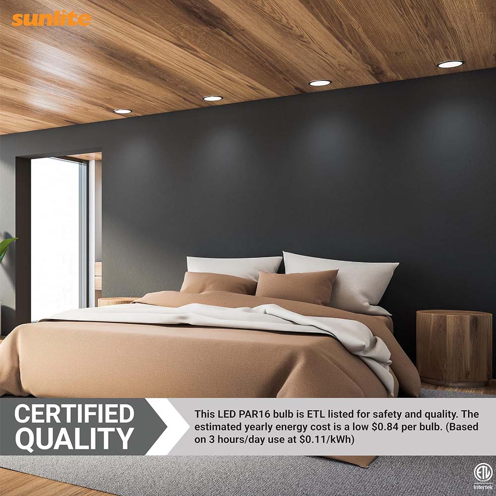 Whether youre setting the mood in the living room or looking for lighting in your kitchen, Sunlite LED PAR16 short neck light bulb has got your covered. Thanks to the inner reflective glass of the PAR16, it offers directional lighting which makes it perfect for track lighting, recessed lighting, desk lights, display case lighting, etc. With its dimming options, cool white light and instant brightness, the bulb will create a comfortable environment in every room of your home. Sunlite PAR16 bulb offers 25000 hours of lighting which is far greater when you compare it to any other lighting source. Fewer replacements means lower maintenance and substantial savings. LED bulbs use 75percent less energy than an incandescent bulb and lasts 25 times longer than a traditional bulb. Sunlite features high quality light bulbs and fixtures designed to meet the needs of your home, office or workplace. We are committed to providing our customers with outstanding service, expertise and high quality products. Our LED PAR16 light bulbs are a safety choice, backed by our 3 year manufacturer warranty.
