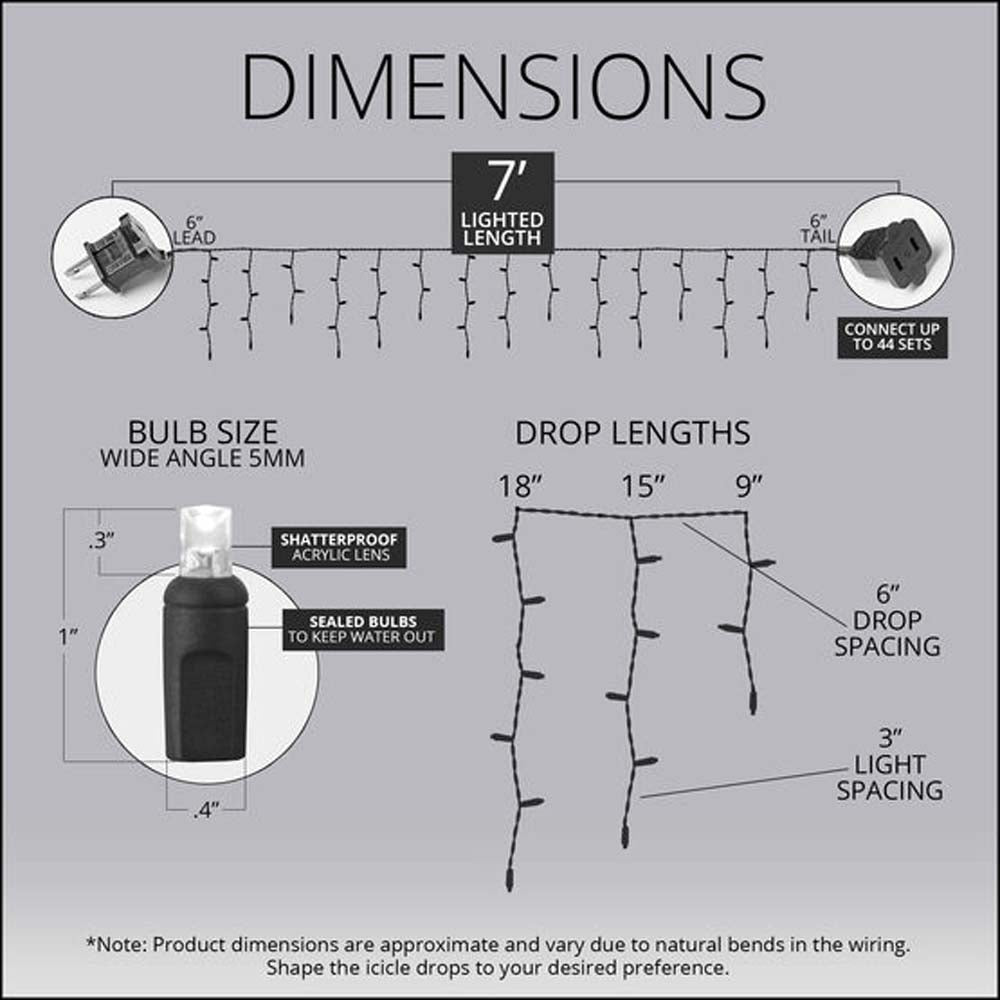- 70 warm white 5mm icicle lights on white wire with 15 drops and 6" space between drops