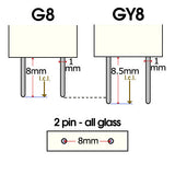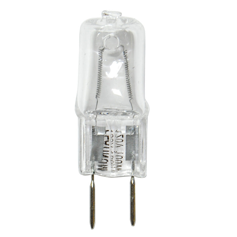 This is the 100W/120V Halogen BulbAmerica. It has a Clear Finish With a GY8 Bi-Pin Base. The overall Length is 1.68in and Diameter 0.54 inches.