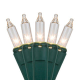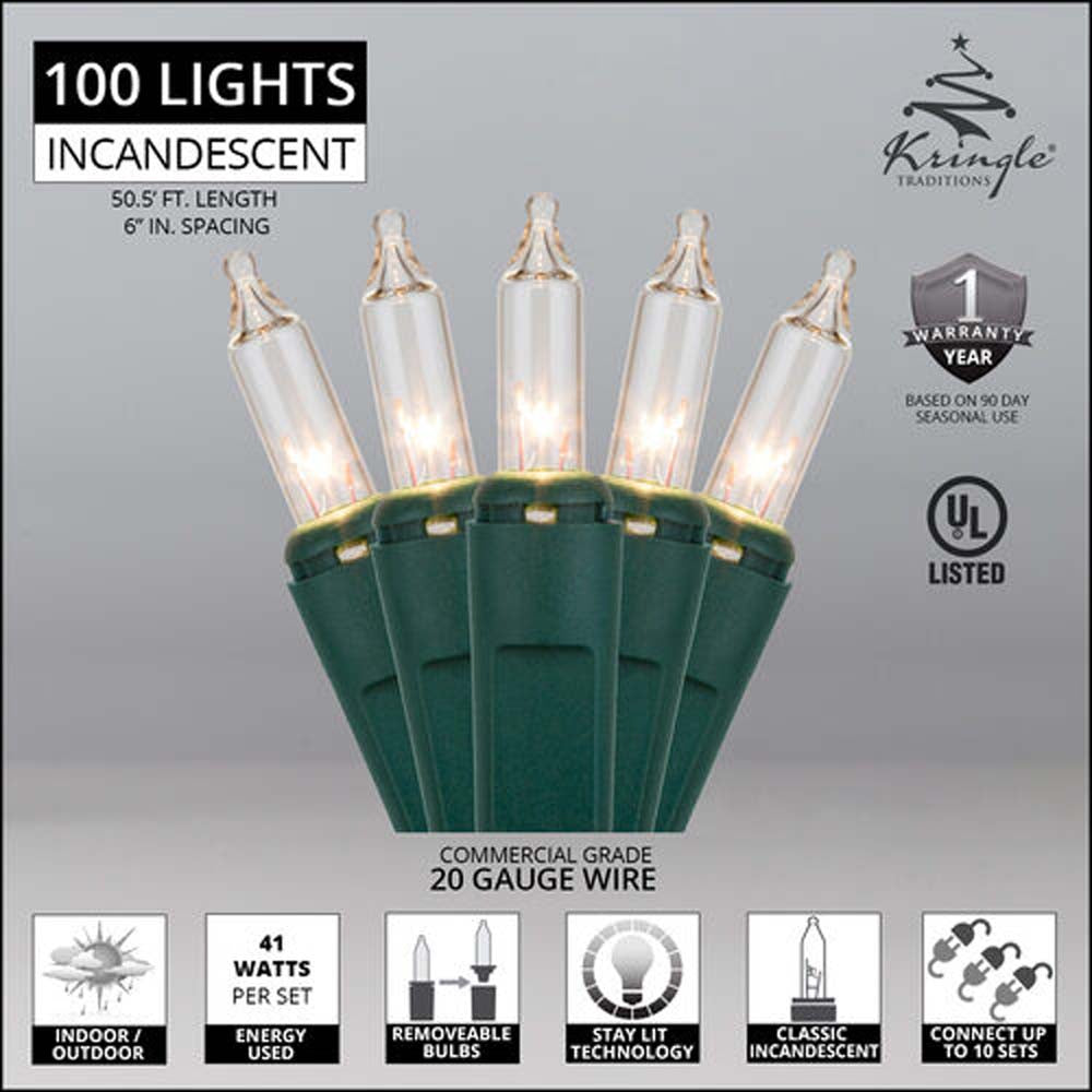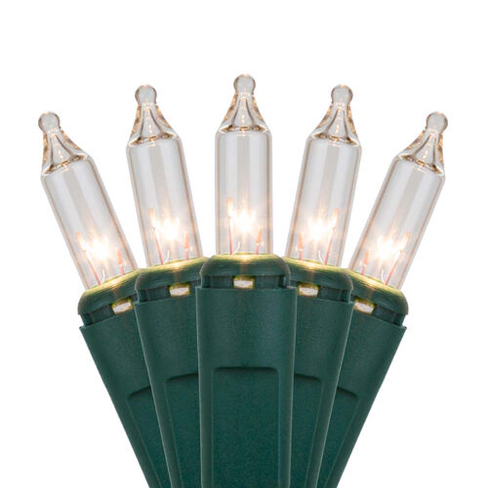 Clear Mini Lights, Commercial Grade One light goes out the rest stay lit, lamp locks, 3,000 average hours 100 clear mini lights, green wire, steady