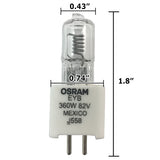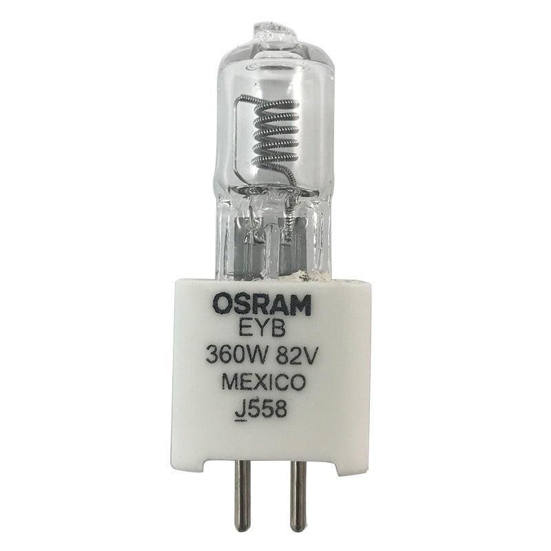 This OSRAM EYB bulb is 360 watts 82 volts and has a G5.3 Bipin base. The EYB lamp can last up to 75 hours and has a luminous flux of 10,000LM. The OSRAM EYB replacement lamp have a clear finish and gives off a 3250K color temperature.