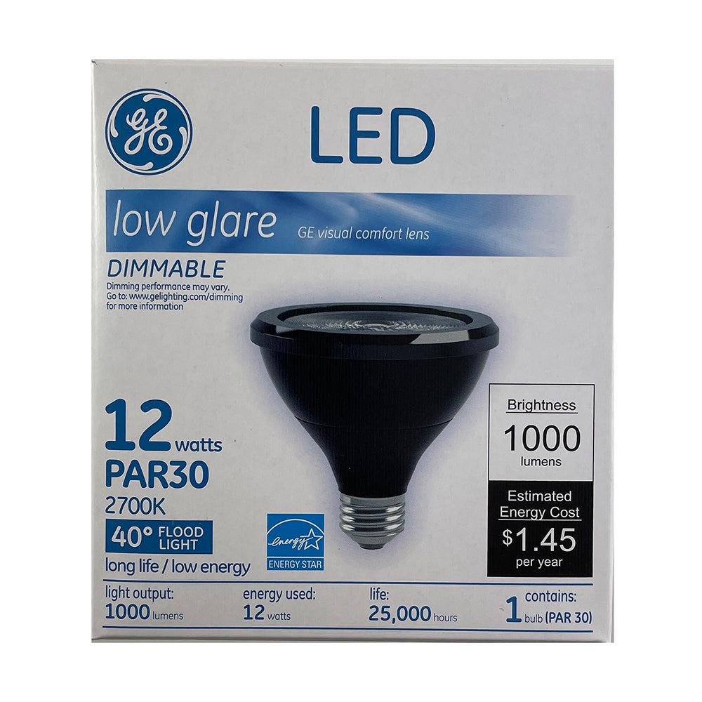 GE Lighting PAR 30 Low Glare Visual Comfort Lens LED Lamp. LED Lamps, 12 Watt, 1000 Lumen, 2700K Warm White, 80 CRI, Dimmable, PAR30, Medium Screw Base, 25,000 Rated Life, Flood, Color Black.