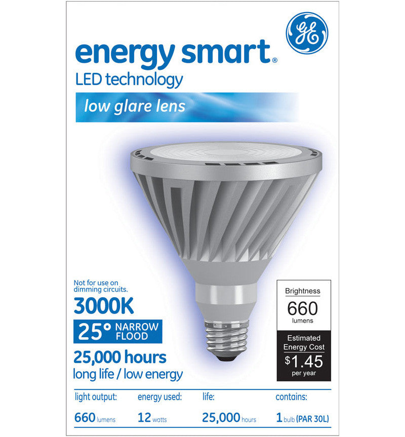 GE 12w PAR30L Dimmable LED Bulbs, Lamp Finish: Silver, Rated Life: 25000, Beam Spread: Narrow Flood NFL, Color Temperature: 3000K Soft White