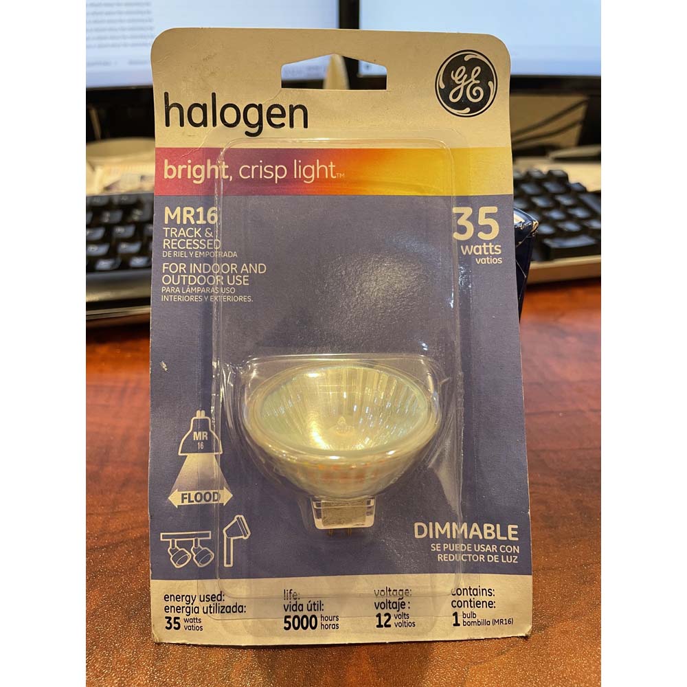GE 77911 Halogen Indoor/Outdoor Floodlight Mr16 35-Watt . Halogen lamps provide a small, white light source with excellent color rendering. Unlike standard incandescent lamps, halogen lamps use a halogen gas which allows the bulbs to burn longer without sacrificing light output. Compared to incandescent lamps, halogen lamps provide crisp white light, excellent beam control, compact size, high lumen maintenance, and a longer life.