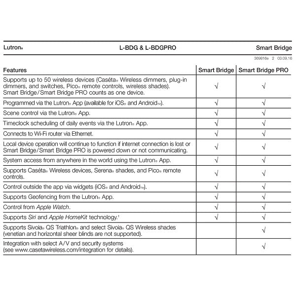 The Smart Bridge PRO allow for setup, control, and monitoring of Casta Wireless devices and Lutron wireless shades from a smartphone or tablet using the Lutron App.