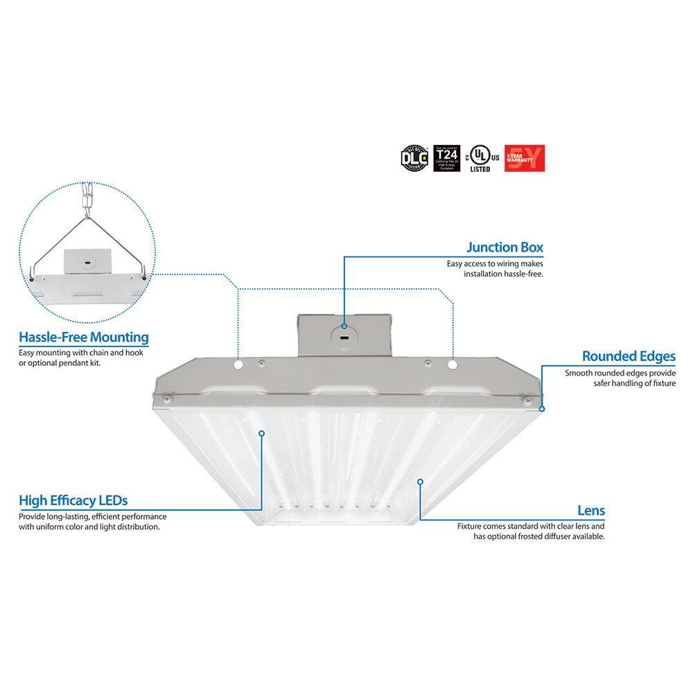 The HBL is the premier lighting solution for a wide variety of lighting applications and mounting heights. The very efficient HBL LED High Bay emits 120 Lumens per Watt of Energy, making it one of the most energy efficient products on the market. A choice of lumen outputs and color temperatures make the energy-efficient HBL the ideal solution for commercial and other high bay applications. The HBL features a vented steel housing to provide heat displacement through convection. Includes V-Hooks and Mounting Chains for hanging, and comes with a 5 Year Limited Warranty. Comes with everything you need for installation directly out of the box. Title 24 and DLC Listed.