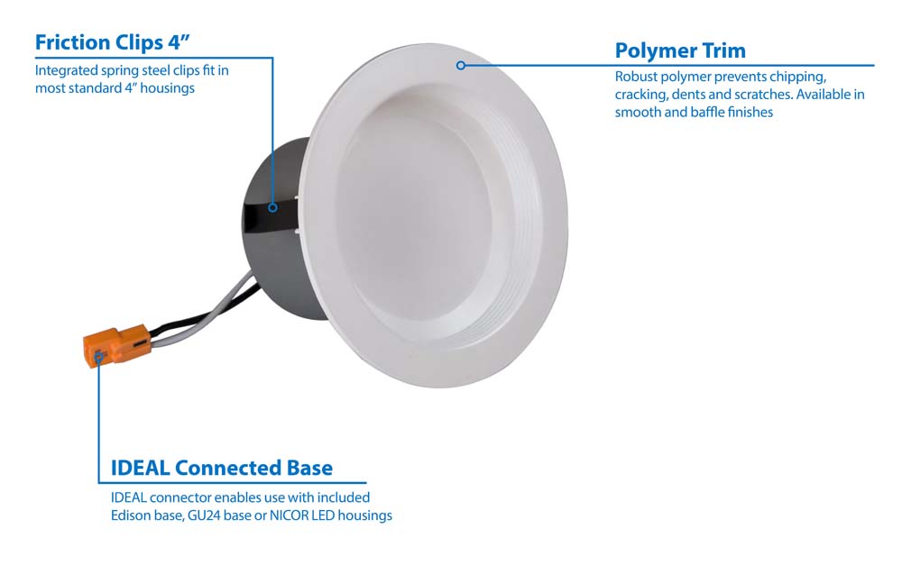 - Designed to be compatible with any 4 inch recessed housing, but works best with NICOR's 19000A-LED-ID or 19001AR-LED-ID