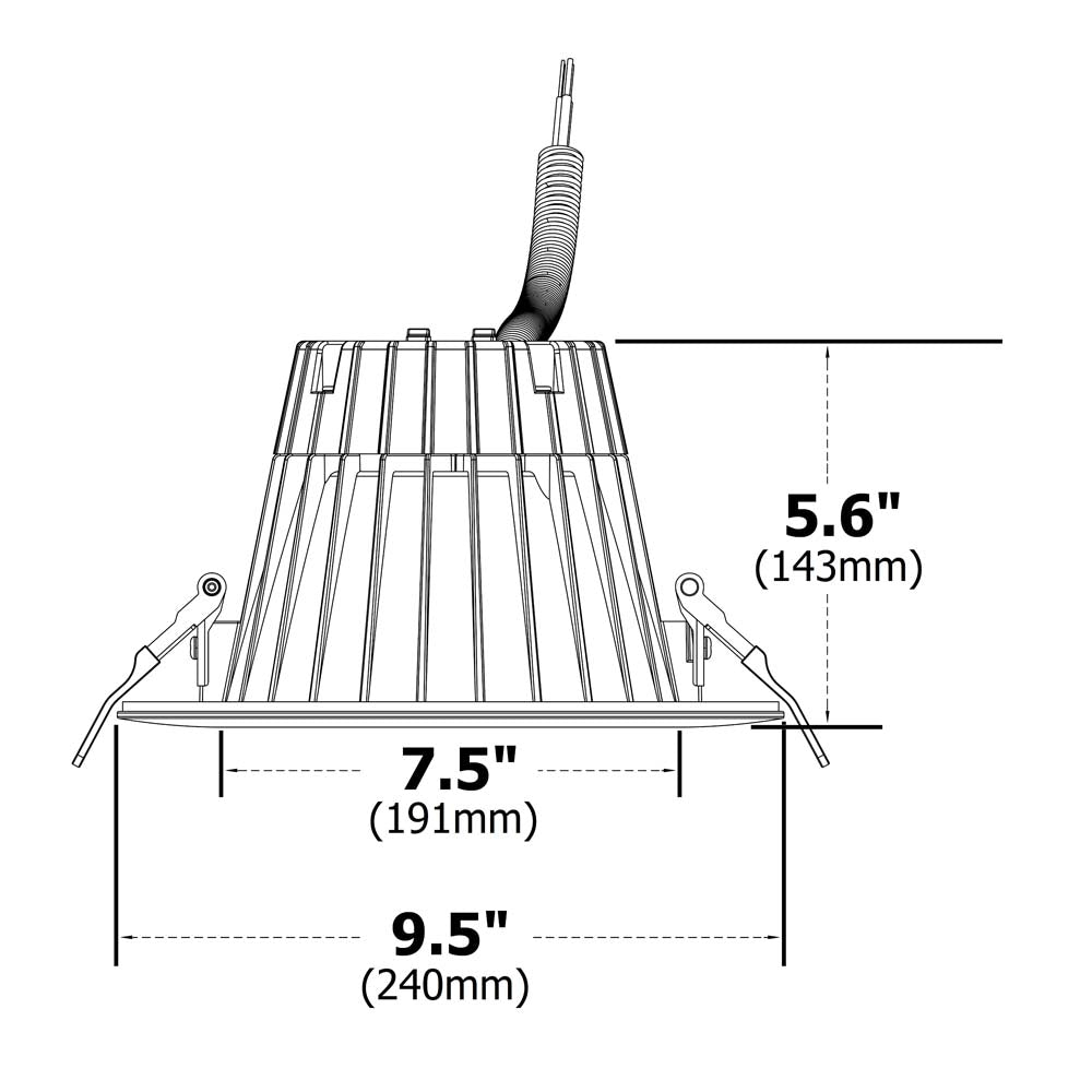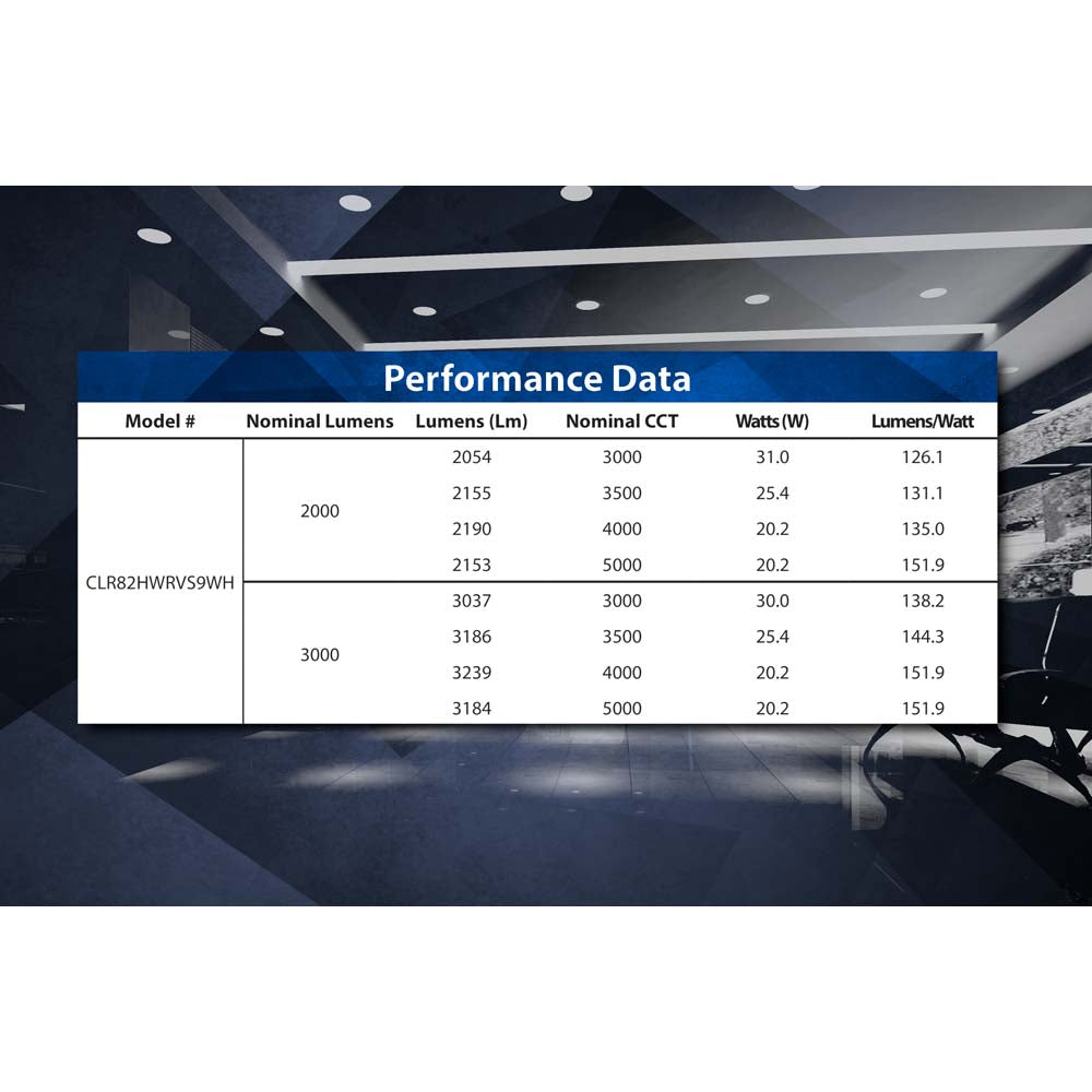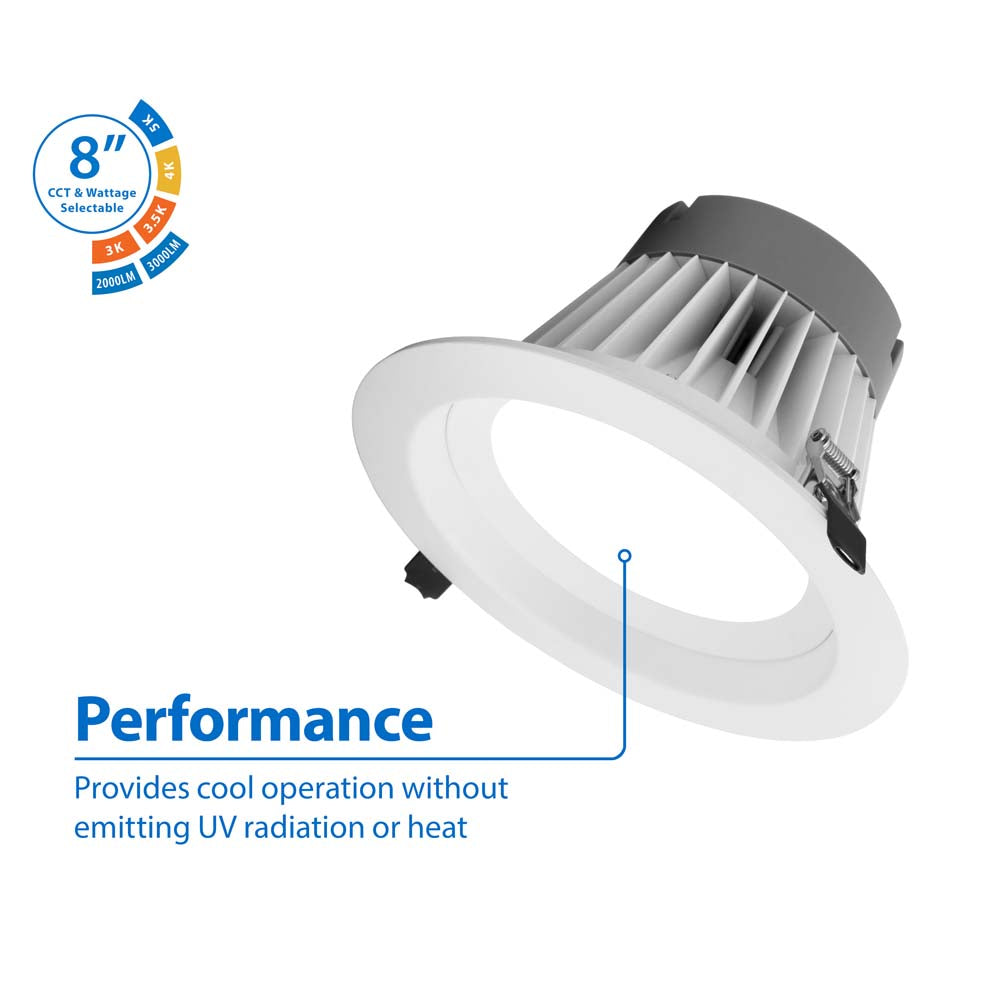 The NICOR CLR8-Select is a complete 8-inch recessed LED downlight system built to commercial grade specifications. The Canless design allows for direct installation into drywall, ceiling grids, or existing mounting frames, bypassing the need for a recessed housing. Installation requires a simple circular cut-out in the ceiling using the included template. This high-output CLR8-Select features a switch on the back to select between 3000K, 3500K, 4000K, and 5000K color temperatures. Another switch lets you toggle between 2,000 and 3,000 lumens, allowing you to control the power and brightness. The CLR8-Select is also wet-location rated, energy star rated, and airtight. It features full-range dimming (0-10VDC) and a built-in multi-volt driver (120-347-Volts). In short, it is the most versatile and complete commercial downlight system to date. It can be installed anywhere, in any setting. Use it for new construction, remodel, or retrofit applications. Available in Black, Nickel, Aged Copper, and White. The CLR8-Select is protected by NICORs 5-year limited warranty.