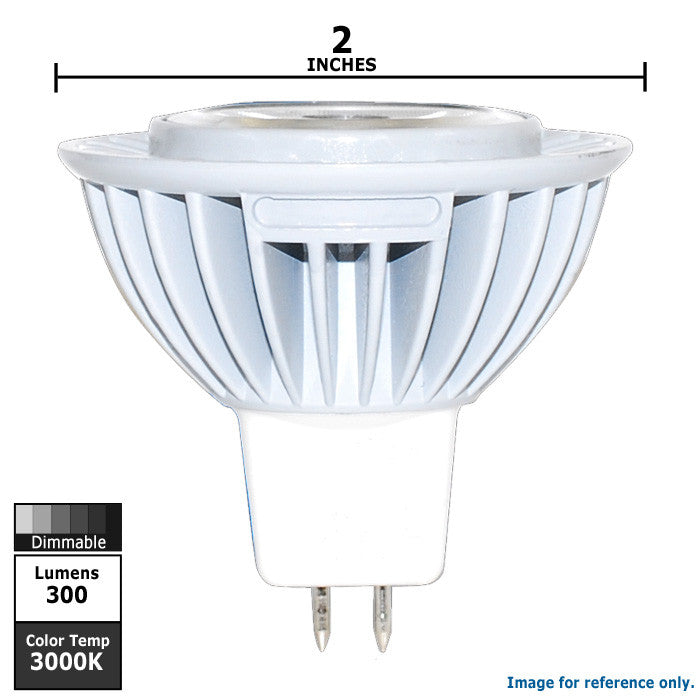 Key Features & Benefits: - 6W LED lamp designed as high quality replacement of 20W halogen MR16 lamps - Dimmable 10%100% (Performance may vary depending on dimmer used in application) - 35,000 hours life at 70% lumen maintenance - Suitable for indoor environments - 3000K CCT and 87 CRI - GU5.3 base - Reduces energy consumption up to 70% - Lasts 17 times longer than halogen lamps - No warm-up time, instant-on with full light output and stable color - 12V AC input voltage - Mercury free and RoHS compliant - UV and IR free