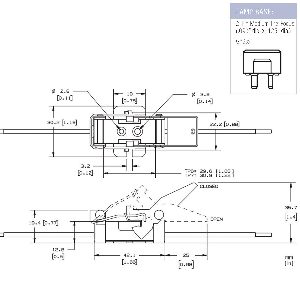 This lamp holder is for GY9.5 base for bulbs like: - DYR - DYS - DYS-5 - FDS / DZE 64643 - 64654 HLX 24V - FDT 64628 - 235T4Q / 2PPF - DZE / FDS - EKD - FTK - HTI150 - FRK- Maximum Wattage: 1200 W TP7L or R (GY9.5)- Maximum Voltage 250 V- Maximum Operating Temperature 200 C- Qualifications UL Recognized E31557 CSA Certified LR20904- Body Material: Steatite / Nickel Plated Steel- Contact Material: Nickel Alloy- Wire Leads AWG16, 300 V/105 C minimum- Wire length: 9 inch