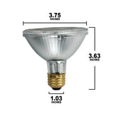 75 watts 120 volts PAR30 E26 base Flood 30 degree Halogen Light Bulb Philips Halogen PAR lamps will provide bright, white light across the product line and feature excellent beam qualities for accent or ambient lighting. Their optimized coil and burner design allows for clear, crisp lighting effects with excellent color rendering, making it easy to optimize the look and feel of your store and your merchandise. - Reduced maintenance and operating costs. - Create a variety of atmospheres and provide a comfortable shopping experience. - Variety of beam spreads and wattages. - Beam spread Flood, with wattage of 50. - Philips Halogen lamps last 20003500 hours rated average life. - Bright, White Light. - Optimized coil and burner design allows for clear, crisp lighting effects with excellent color rendering. - Available in 75 Watts Flood. - Ideal for retail, residential, and commercial applications. For indoor and outdoor use.