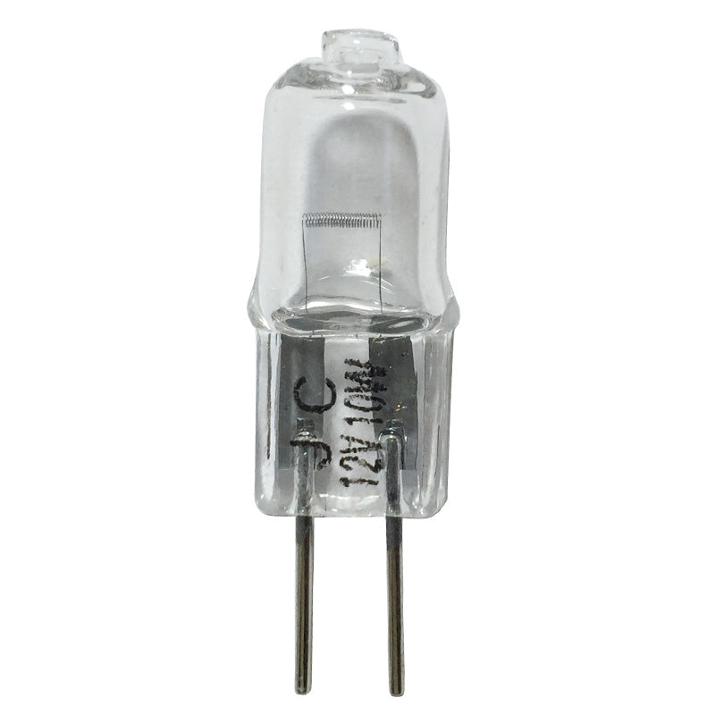 This is the Tungsten Halogen Quartz Bi-Pin STANDARD bulb. It has a Low Pressure Clear Finish. It also has a UV-Stop With Transverse Filament. The base consists of G4 Bi-Pin Base working with a 10Watt 12Volt system. It also has a 2000Hr Lamp Life.
