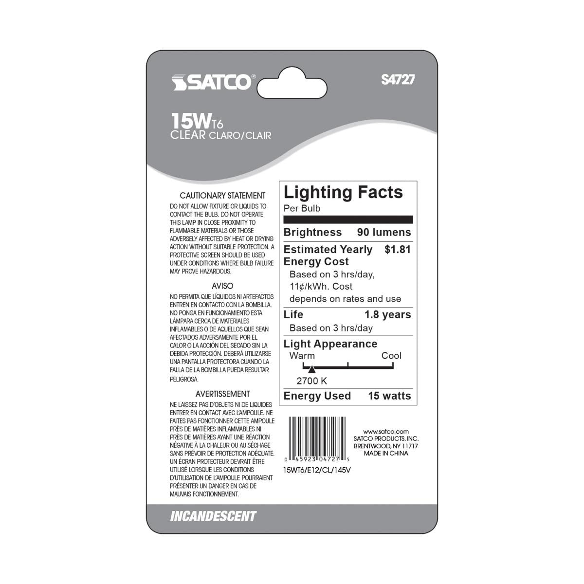 Satco 15w T6 Incandescent Clear 2000 Average rated hours 90 Lumens Candelabra base 145v