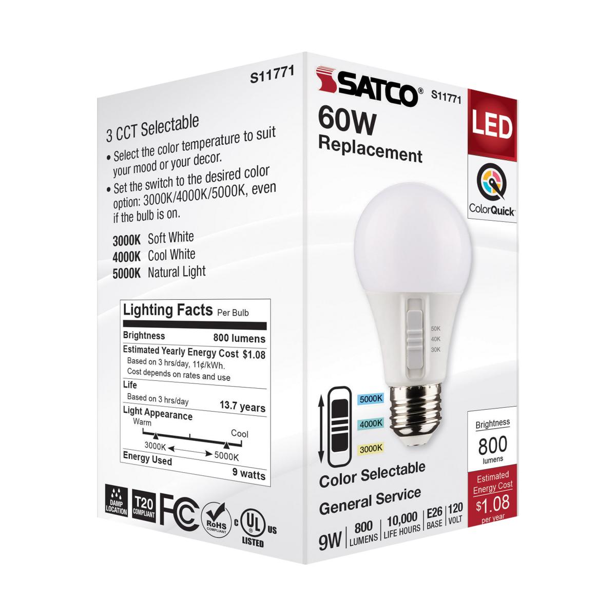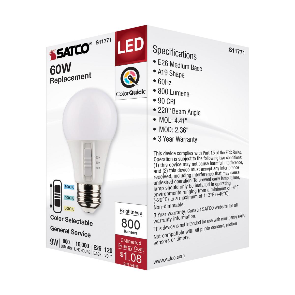 Illuminate any space with ease using SATCO NUVO 9W A19 lamps with E26 base and ColorQuick technology. These versatile lamps allow you to choose the perfect color temperature for any room, creating an atmosphere that suits your mood. Whether you want to relax in the living room after a long day, or work in a well-lit office, our lamps offer the perfect lighting solution. With a high 90 CRI, our lamps provide exceptional color rendering, ensuring that colors look vibrant and true-to-life. They are also rated for damp locations and enclosed fixtures, making them suitable for use in any area of your home. Ideal for use in bedrooms, living rooms, offices, table lamps, floor lamps, ceiling fans, and more, these A19 lamps are the perfect addition to any space.