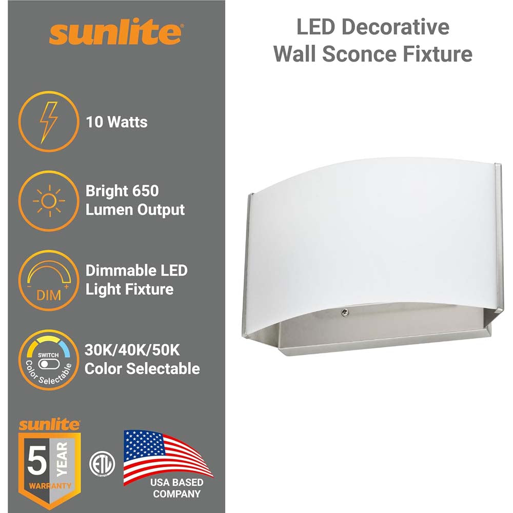 Sunlite Wall Sconce fixture adds a touch of elegance to any contemporary interior. Made of durable aluminum and steel with a brushed nickel finish it features a white polycarbonate lens that provides optimal light distribution and a soft ambient glow. You can select from three different color temperatures 3000K Warm White 4000K Cool White or 5000K Daylight depending on your preference using a switch on the fixture. The dimmable fixture uses only 10 watts of electricity and provides an output of 650 lumens of light. With a lifespan of up to 50,000 hours it is designed for years of reliable and maintenance-free service with no bulbs to replace. The lighting output can be changed when connected to a Forward Phase (TRIAC or Incandescent) dimmer allowing you to adjust the brightness from 10-100 percent. This sconce is easy to install on any junction box and is ideal for hallways entryways office spaces bathrooms powder rooms and more. ETL Listed for Damp Location installation you can rest assured that its a safe and high-quality choice. Fixture Dimensions 4.375 H x 6.75 W x 2.75 D.