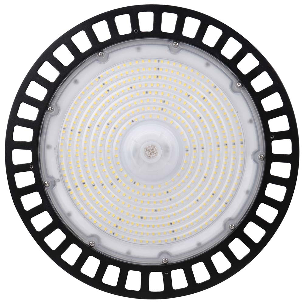 Upgrade to energy-efficient lighting with Sunlite sleek UFO-style high bay fixture featuring a durable lightweight die-cast aluminum body for optimal heat dissipation. Enjoy 28000 lumens of 5000K Super White light while consuming only 200 watts resulting in significant energy savings. With a 50000-hour lifespan 500 built-in LEDs and 0-10V dimmability experience reliable maintenance-free lighting in commercial spaces such as warehouses workshops and retail areas. UL Listed for wet locations and IP65 rated this fixture is suitable for 120-277-volt electrical systems and includes a 39.6 AC cord. Dimensions: 12.6 D x 5 H.