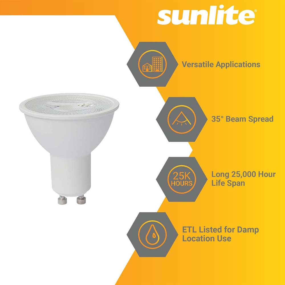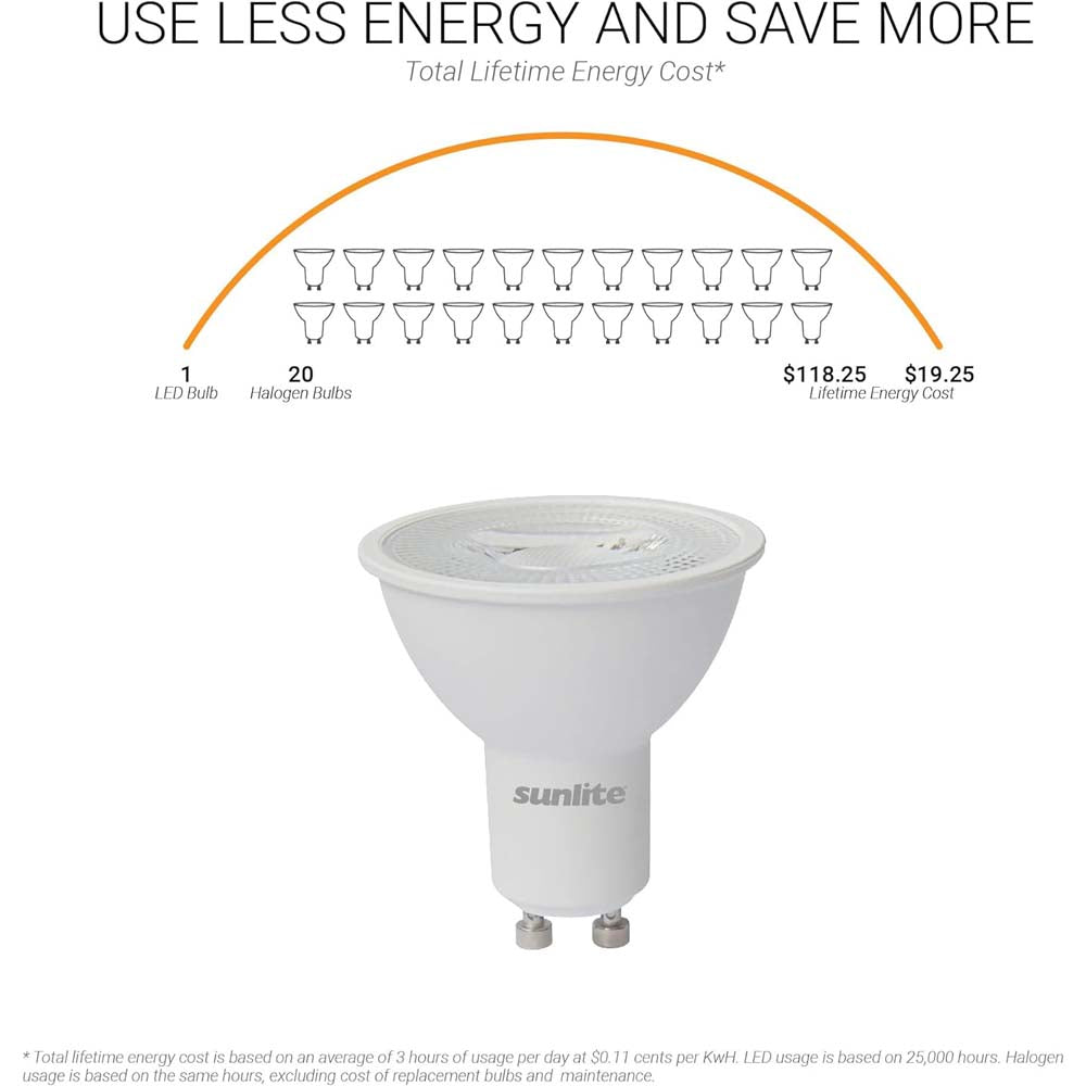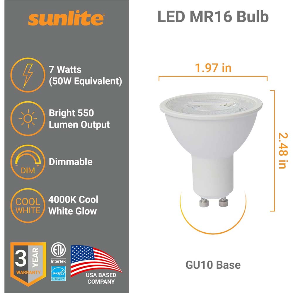 Sunlite MR16 LED 120 volt reflector bulbs are dimmable and have been designed to give you up to 25,000 hours of reliable service. That means fewer replacements for difficult to reach bulbs. These durable led bulbs provide the same output as a 50-watt bulb while only using 7 watts of energy. With upgrading to LED technology, you will get a bulb that is cooler to the touch and instant-on at full brightness with no warmup time. This bulb is ETL Listed and features a GU10 Base.