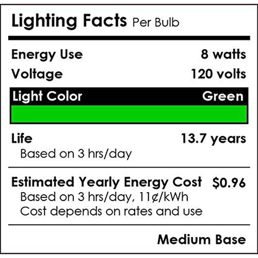 - ENERGY EFFICIENT - These bulbs only use 8 watts of electricity and put out a vibrant green light that is equivalent to a 75 watt halogen bulb. Annual energy cost is a low $0.96. (Based on 3 hours/day at $0.11/kWh)