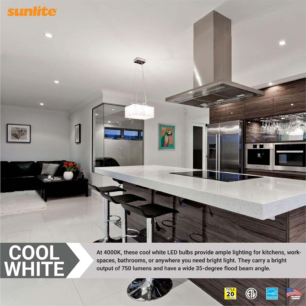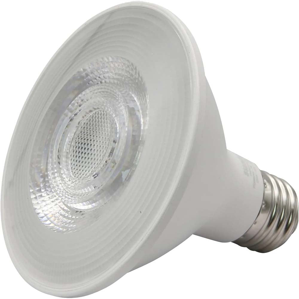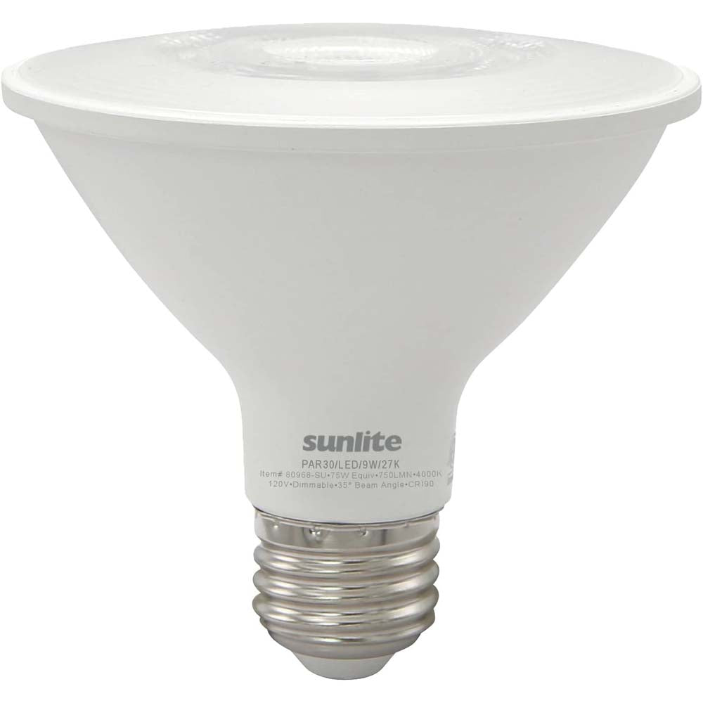 Upgrade your incandescent and halogen PAR30 bulbs with energy efficient LED bulbs from Sunlite. These medium base (E26) bulbs are direct replacements for your track lighting, accent lighting, pendant fixtures and more. They remain cooler to the touch than other bulbs making them safe for enclosed fixtures. They give off as much light as a 75-watt bulb while only using 9 watts of power. Estimated yearly energy cost is a low $1.08. (Based on 3 hours/day use at $0.11/kWh). At 4000K these cool white bulbs provide ample lighting for hallways, stairways, closets, bathrooms, vanities or anywhere you need cool and bright light. Bright 750 lumen output and 25,000 hour life span for years of maintenance-free use.Compatible Dimmers: LEVITON 6681, 6674, 6633P, IPL06, IPI06, VPM10, RTD01-10Z, IPE04, 6161, RPI06-1, 1B3211, 1C1311 & LUTRON S-600P, LGCL-153P, LGCL-153PL, LGCL-153PLH, MACL-153M, MAELV-600, DVELV-300P, DVCL-153P, CTCL-153P, VTELV-600M, CTELV-303P, DVELV-303P, RRD-6NA, DVCL-153P, NTLV-600, S-603P, DV-600P, DV-603P, V47-C06579, SLV-600P, IPX10-1, SELV300P, MRF2-3LDH, DVWCL-153PH. SCL-153P.